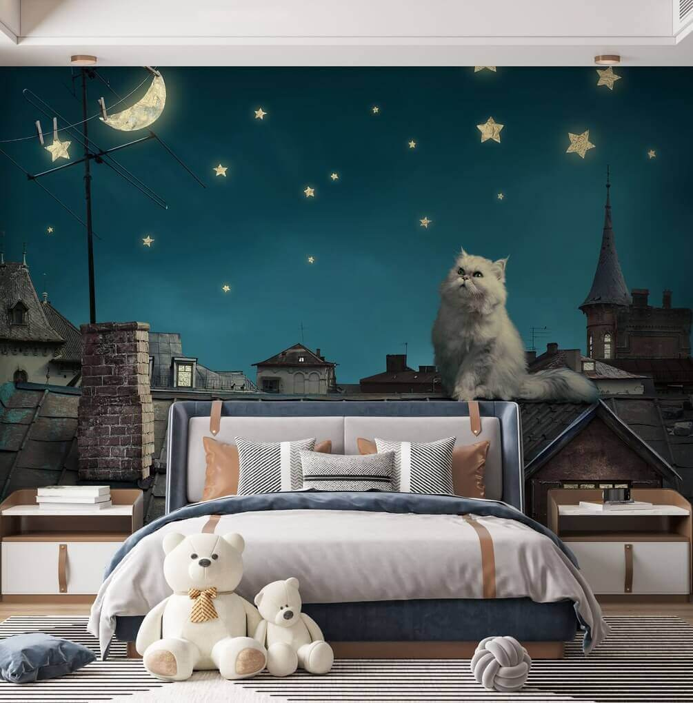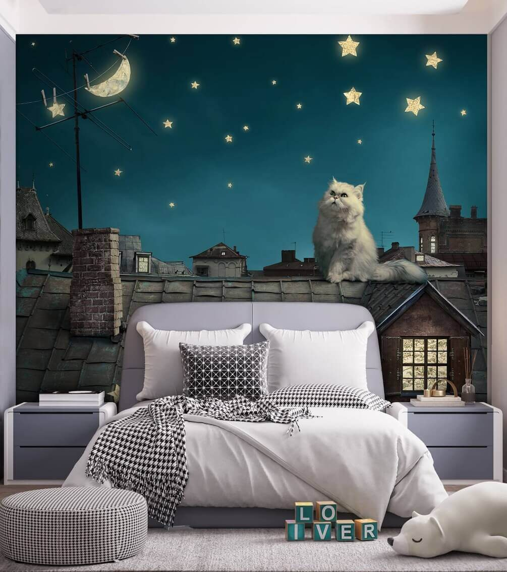 Itt egy falfestmény, amely a tetőtéri éjszakákról és a csillagos égboltról fog álmodozni. A “Macska bámulja az éjszakai égboltot” olyan, mintha egy szeszélyes esti meséből lépett volna elő. Képzeld el ezt a jelenetet a nappalidban vagy egy gyerekszobában – annyira varázslatos! A macska álmodozó tekintete a csillagokra egyszerűen varázslatos, békés menekülés a nyüzsgésből. A gyerekek imádni fogják a játékos hangulatot, a felnőttek pedig a nyugtató esztétikát. Az absztrakt báj és a gyermeki csoda keveréke, amely tökéletes a képzelet beindítására. Ráadásul ki tudna ellenállni annak az imádnivaló, bolyhos macskának, amely kíváncsian néz az éjszakába?