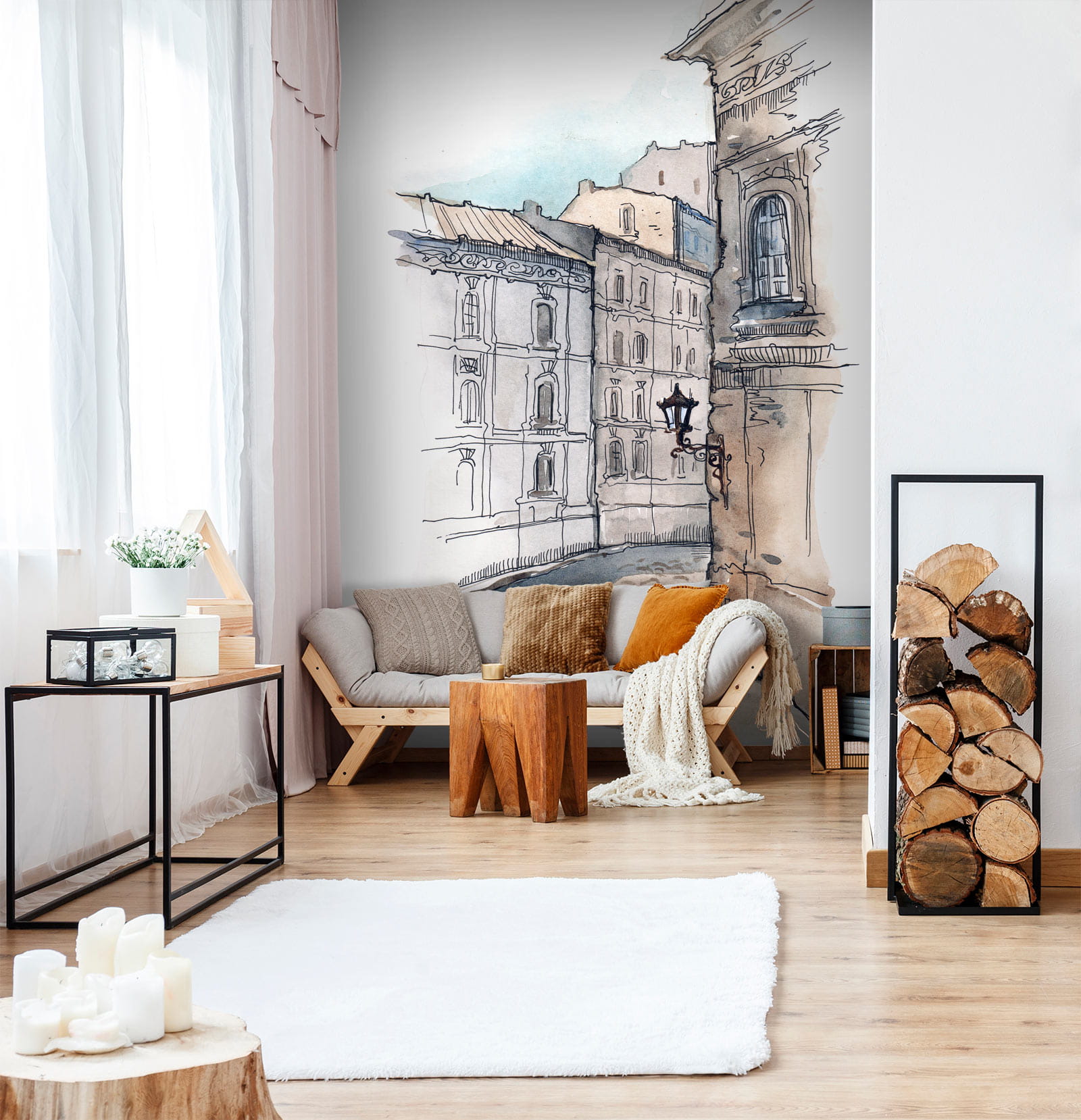 Ezek a tompa kék és barna színek gyönyörűen illeszkednek a modern és a rusztikus dekorációhoz egyaránt. Helyezzen a közelbe egy kényelmes karosszéket, és máris megvan a tökéletes kis menekülés – anélkül, hogy elhagyná a házat! Van valami olyan hívogató ebben a jelenetben. Olyan, mintha az utca hívogatna, hogy bolyongj és csodálkozz. Egyszerűen gyönyörű.