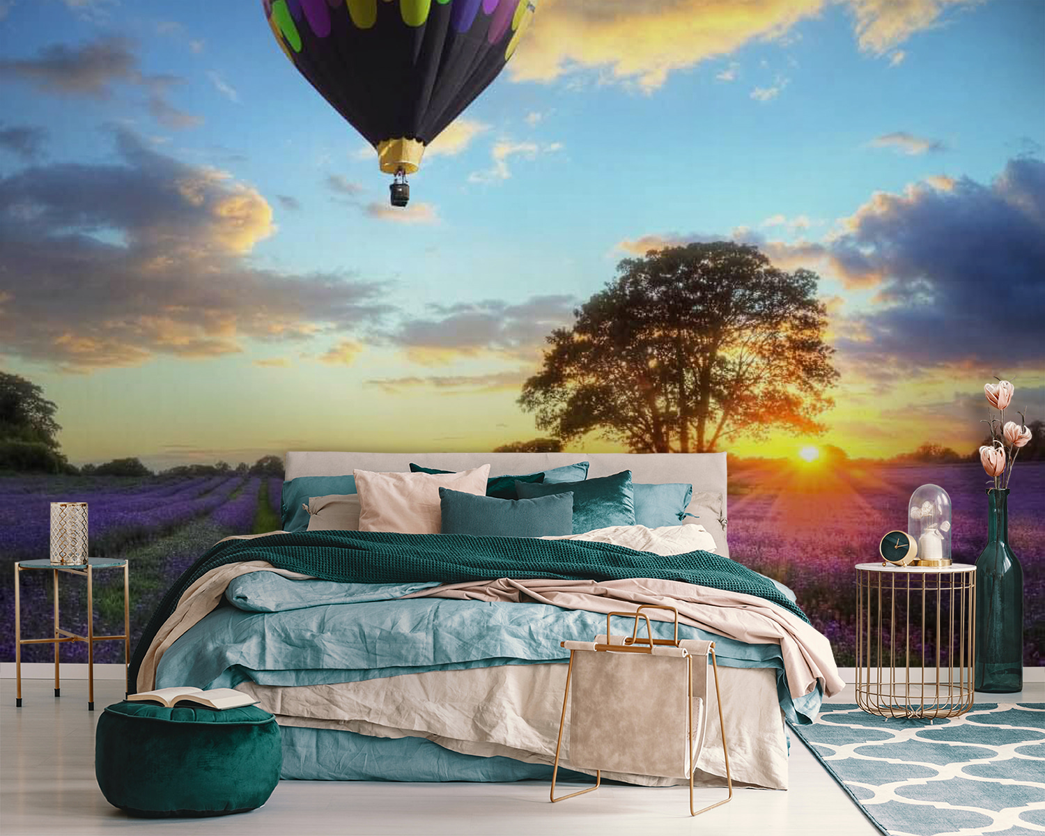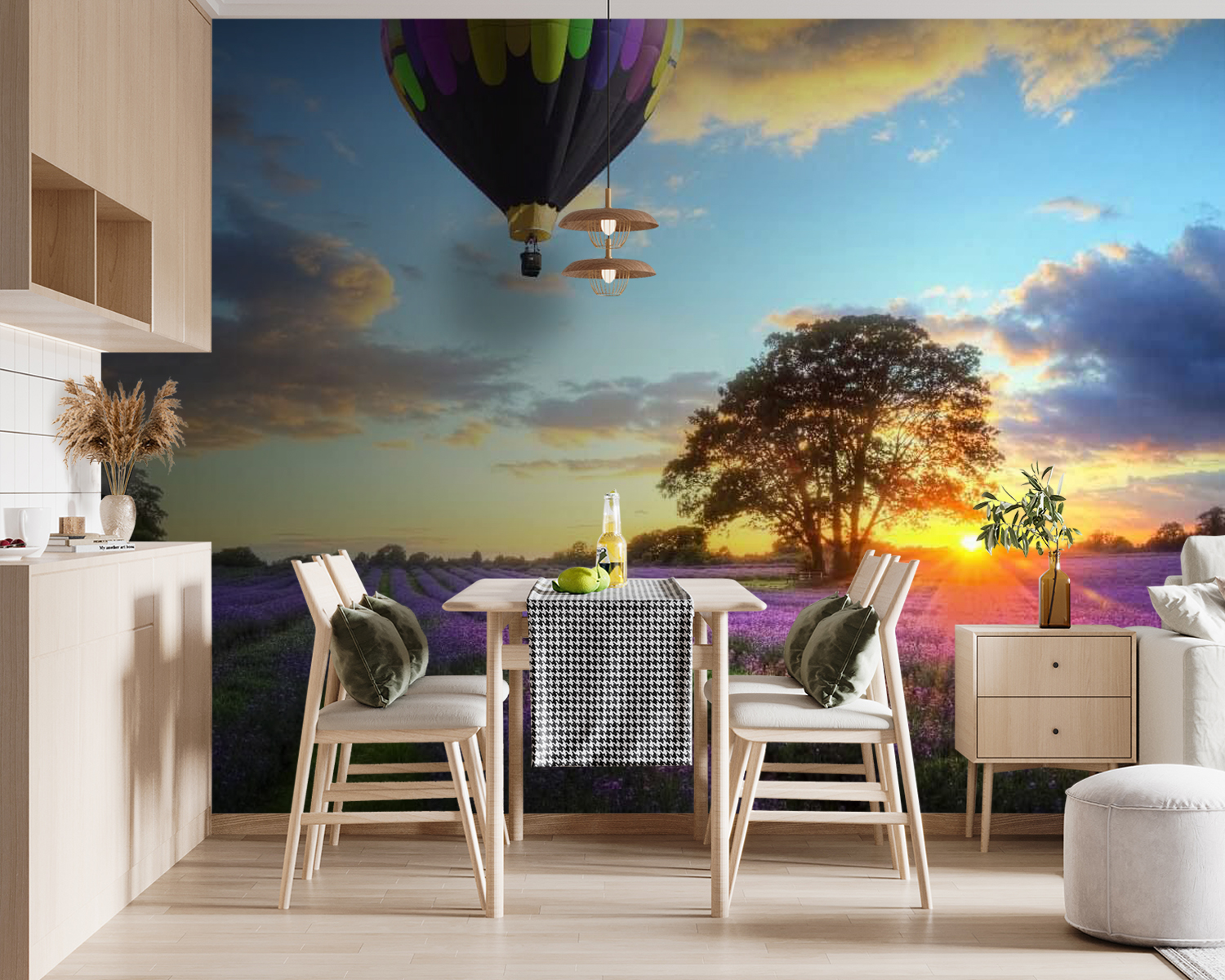 Képzelje el: egy mező, amely tele van élénk lila virágokkal, a naplemente meleg színeivel festett ég alatt. És ott, kecsesen lebegve a mező felett, egy csoport szeszélyes hőlégballon, mint cukorkaszínű álmok, amelyek repülni kezdenek. Ez a falfestmény nem csak díszít, hanem mindenkit álmodozásra és egy nyugodt világba való menekülésre invitál. Képzelje el, hogy belép a szobájába, és egy gyengéd, nyugodt szellő áramlik át rajta, mintha belépett volna a saját békés menedékébe. Mintha egy mini-vakációt élvezne a falán! Tökéletes minden olyan szobához, amelynek szüksége van egy kis vidámságra, és lágyan suttogja a kalandok és a természet szépségének meséit. Ideális azok számára, akik szeretik a virágokat, az égbolt nézését, vagy csak egy kis varázslatot a mindennapi életben. Ki ne szeretne elrepülni egy színes léggömbön a levendulamező felett?