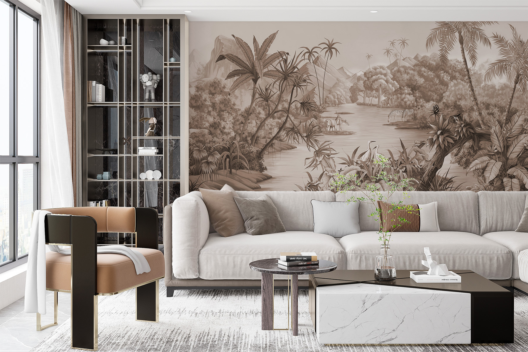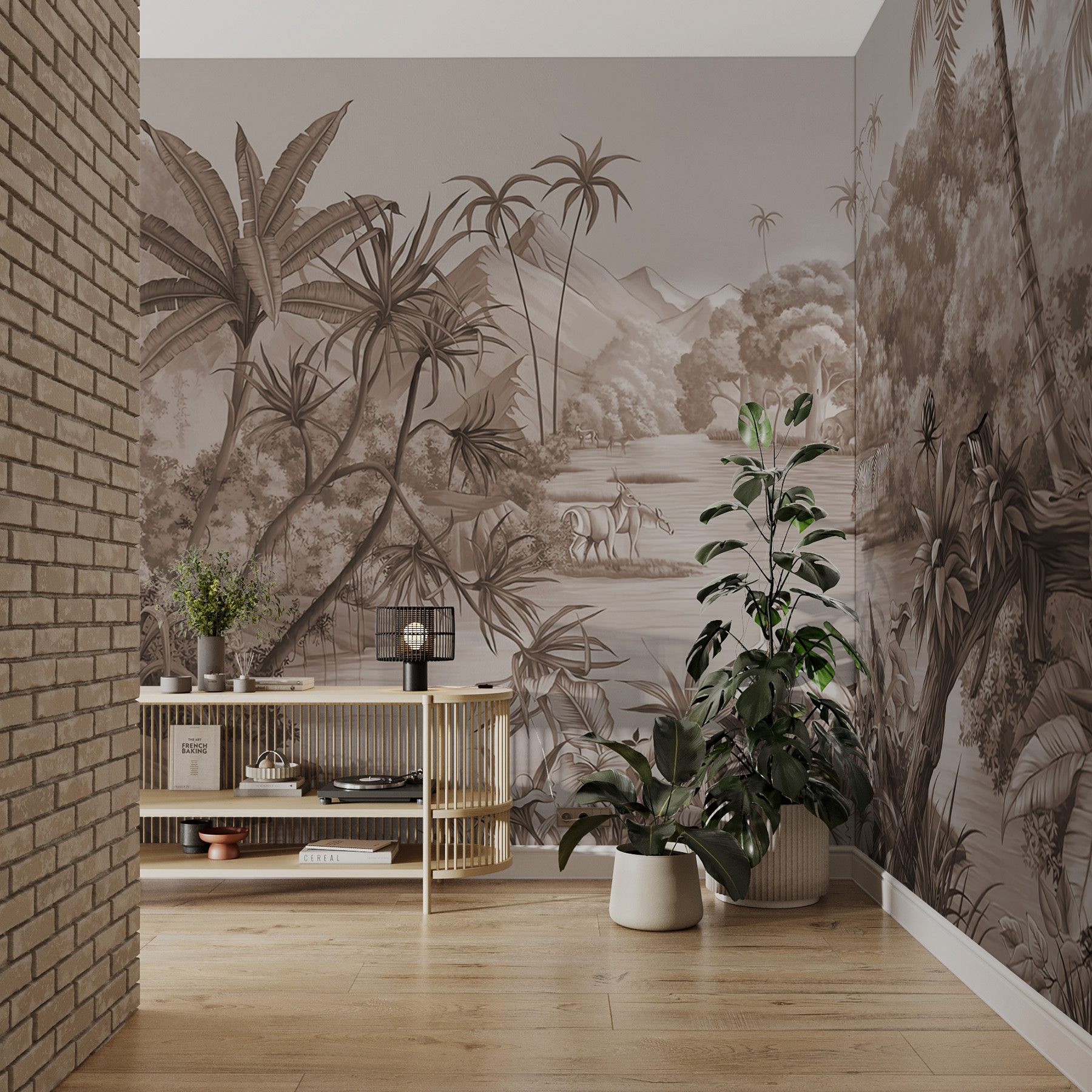 Változtasson bármelyik szobát trópusi meneküléssé ezzel a lenyűgöző falfestménnyel, amely egy vibráló dzsungeljelenetet ábrázol. Képzelje el, ahogy a természet hangjaival körülvéve lazít, miközben kecses állatok kanyarognak a buja lombok között. A falfestmény földszínű tónusai és bonyolult részletei nyugodt légkört teremtenek, így minden pillantás egy mini vakációnak tűnik. Tökéletes egy hangulatos sarokba vagy egy élénk családi szobába, melegségre és kalandra hív. Képzelje el, hogy kávét kortyolgatva vad dzsungelről álmodozik – ki ne szeretné ezt? Hozza be a természet egy kis darabját a házba, és nézze, ahogy a falak életre kelnek!