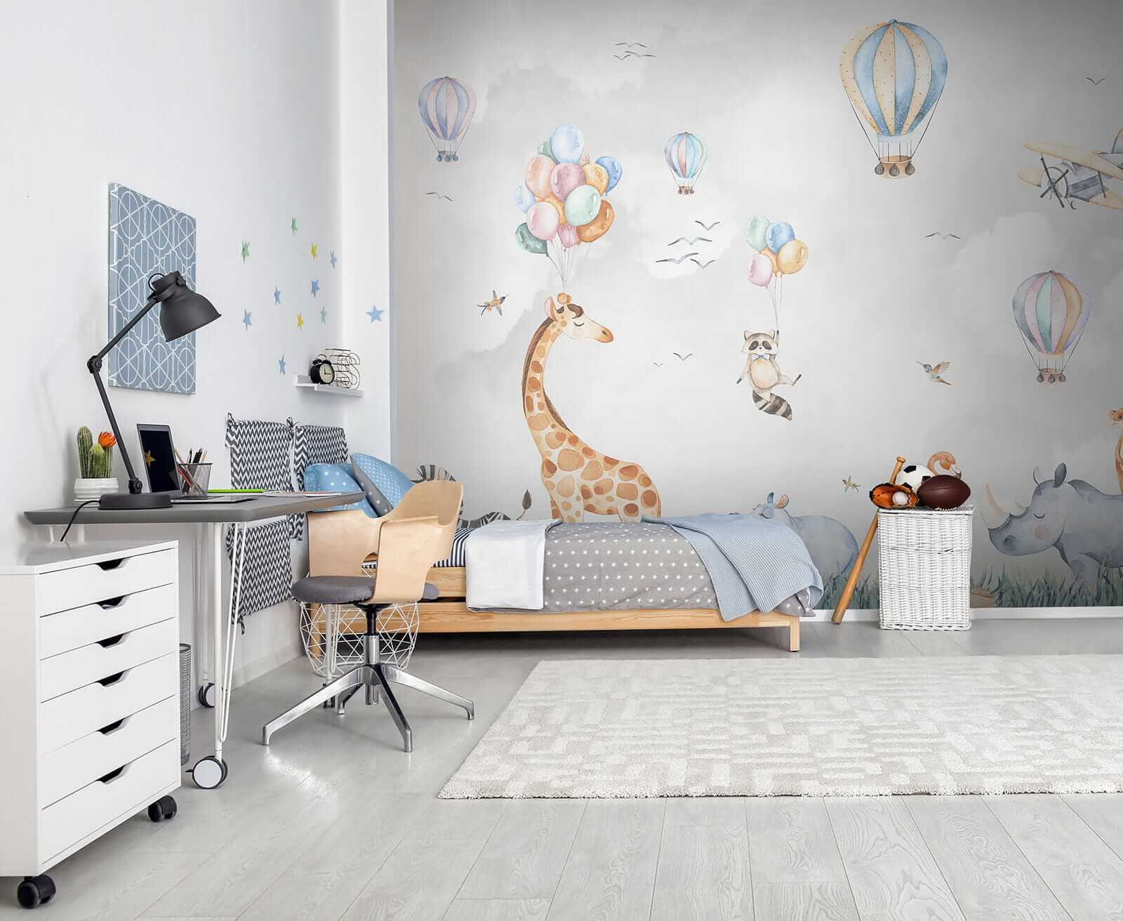 Íme egy kis szeszély a gyerekszobába! A “Víziló a fűben” falfestmény abszolút bájos. Képzeld el, hogy belépsz a szobába, és úgy érzed, mintha egy varázslatos szafarin lennél – hőlégballonok lebegnek, állatok, például zsiráfok és zebrák csak úgy lazítanak a magas füves mezőkön. Még egy pimasz mosómedve is léggömböt tart a kezében! Ez a falfestmény vibráló, játékos hangulatot áraszt, amelyet a gyerekek – és a felnőttek – imádnak. Tökéletes gyerekszobába, fantáziát és kalandvágyat ébreszt. Képzeld el, hogy az esti mesék teljesen új hátteret kapnak, és minden este egy mini kaland lesz. És ki ne szeretné, ha egy boldog víziló lógna a szobájában? Határozottan beszélgetésindító. Készüljön fel a kicsik (és a nagyok is!) óh és áh-ra. Ez nem csak dekoráció, ez öröm a falon.