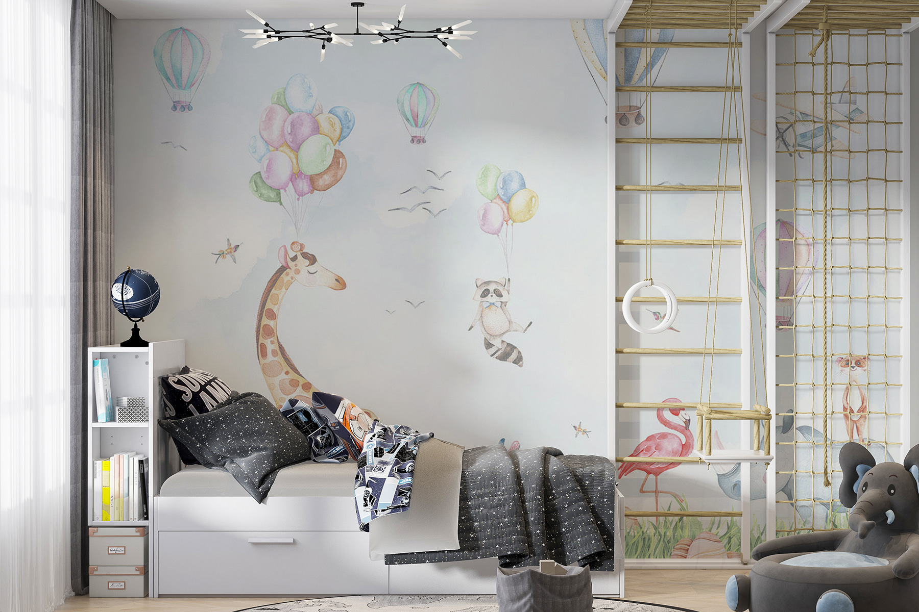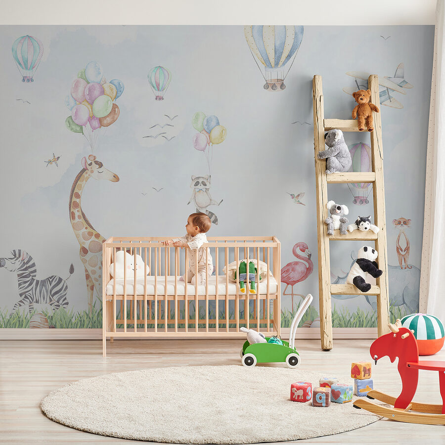 Szeretné feldobni a gyerekszobát egy kis bájjal? Nézd meg ezt az imádnivaló falfestményt, ahol egy orrszarvú, egy róka és szeszélyes barátaik állnak a középpontban! Képzelj el egy nyugodt akvarell csodavilágot, tele hőlégballonokkal, játékos állatokkal és egy égboltot, amely olyan, mint egy lágy, álmodozó ölelés. Ez a falfestmény nem csak szép – varázslatos. Képzeld el: kisgyermeked minden reggel mosolygós szafarira ébred, egy zsiráffal, amely lufit tart a kezében, és egy mosómedvével, amely készen áll a felfedezésre. Mintha egy mesekönyv elevenedne meg, amely mindenféle kalandra és kacagásra invitál. Tökéletes a kreativitás beindításához és a lefekvés varázslatosabbá tételéhez. Tegye ezt a bájos darabot a falára, és nézze, ahogy a vidámság kibontakozik!