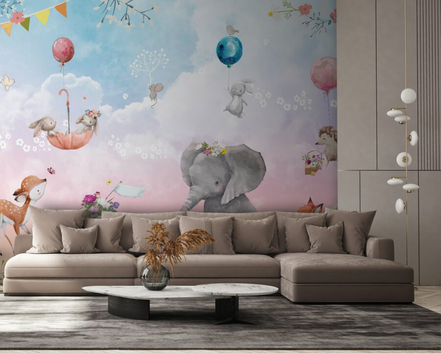 Alakítsd át a teredet ezzel a vidám állatokkal és vidám lufikkal díszített, elbűvölő faliképpel. Képzeld el, ahogy egy kedves, virágokkal díszített elefánt játékos nyuszikkal és egy kíváncsi sünnel osztja meg pillanatait – mindezt egy álomszerű pasztell égbolton. Mintha egy varázslatos mesekönyvből származó jelenet lenne!