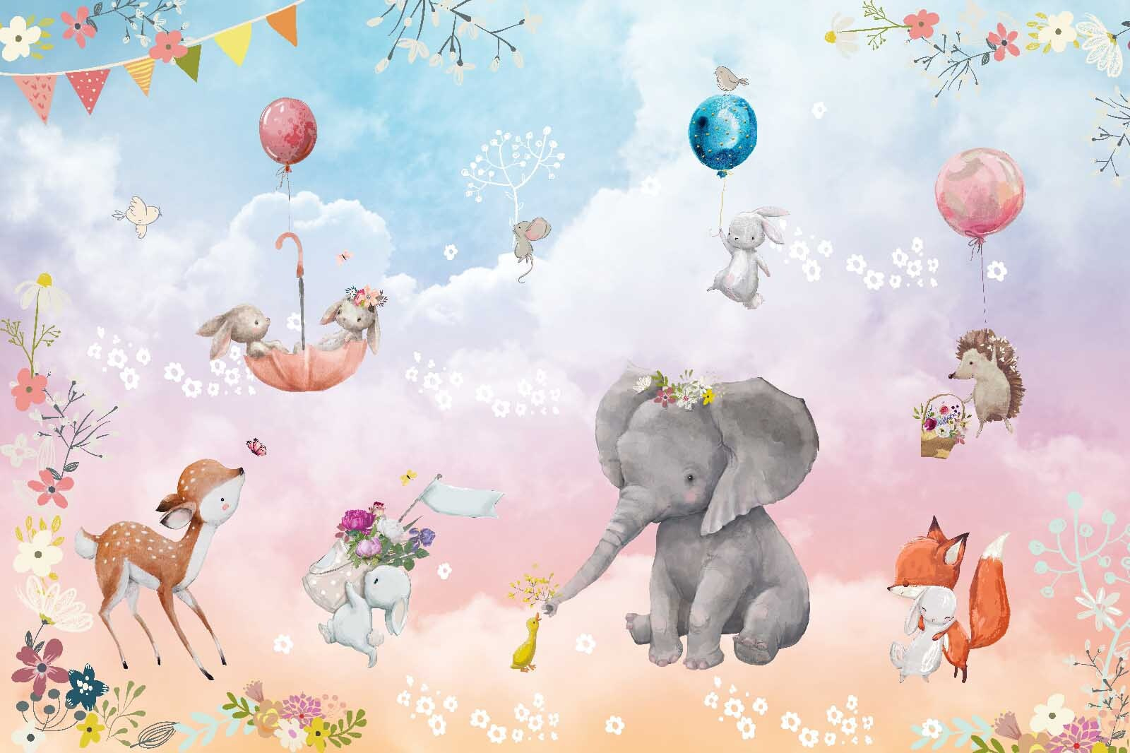 Alakítsd át a teredet ezzel a vidám állatokkal és vidám lufikkal díszített, elbűvölő faliképpel. Képzeld el, ahogy egy kedves, virágokkal díszített elefánt játékos nyuszikkal és egy kíváncsi sünnel osztja meg pillanatait – mindezt egy álomszerű pasztell égbolton. Mintha egy varázslatos mesekönyvből származó jelenet lenne!