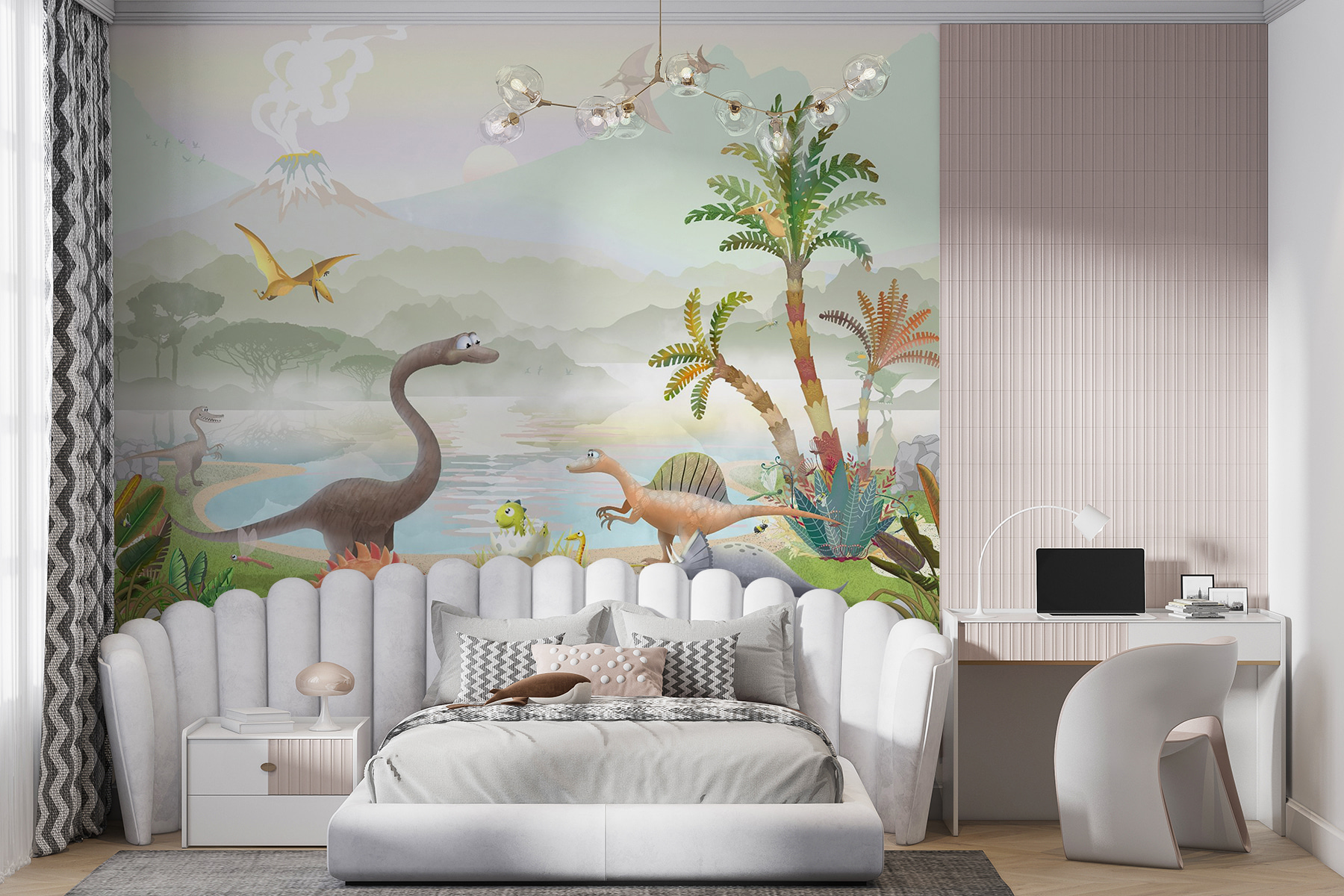 Keresel valamit, ami izgalmassá teszi a gyerekszobát? Nézd meg ezt az imádnivaló falfestményt, amelyen egy pterodaktilusz repül magasan egy rajzfilmszerű dinóvilág felett. Képzeld el: vibráló dinoszauruszok kószálnak, buja őskori növények és egy gőzölgő vulkán a háttérben – mintha egy színes időgépbe csöppentél volna! A gyerekek imádni fogják kedvenc dinoszauruszukat mutogatni, és úgy tenni, mintha a pterodaktilusz mellett repülnének. Tökéletes a képzelet beindítására és bármelyik szoba vidám színfoltjává varázsolására. Te leszel a legmenőbb szülő a környéken!