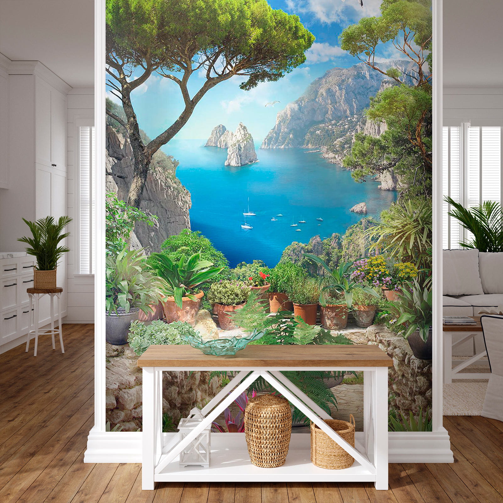 Transform a dull wall into a breathtaking escape with this stunning mural, “View of the Ocean from a Cliff.” Picture yourself sipping coffee while soaking in vibrant blues and lush greens, as if you’re peering over a cliff at the sparkling sea. This mural’s like a mini vacation every day! It captures the beauty of nature with charming potted plants adding that cozy touch. Imagine the birds chirping and that salty breeze wafting in—okay, maybe not, but a girl can dream, right? Perfect for living rooms or cozy nooks, this piece invites daydreams of serene shores and gentle waves.