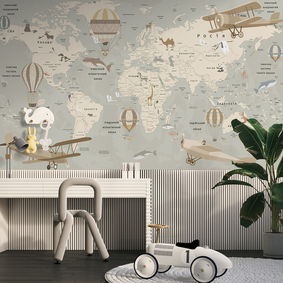 Nézd meg ezt a varázslatos falfestményt, a “Fotótapéta Cartoon of a Plane” című rajzfilmet, amely tökéletes a képzelet beindításához. A világtérképen szétszórt aranyos repülőgépekkel és szeszélyes állatokkal rendelkezik, amelyeknek vintage bája van. Ideális gyerekszobába vagy játszótérre, a falakat játékos kalandzónává változtatja. Képzeld el, ahogy a kicsik arról álmodoznak, hogy zsiráfokkal repülnek Afrika fölött, vagy bálnákkal szárnyalnak az óceánokon – olyan, mintha egy globális kaland lenne a hálószobájukban!