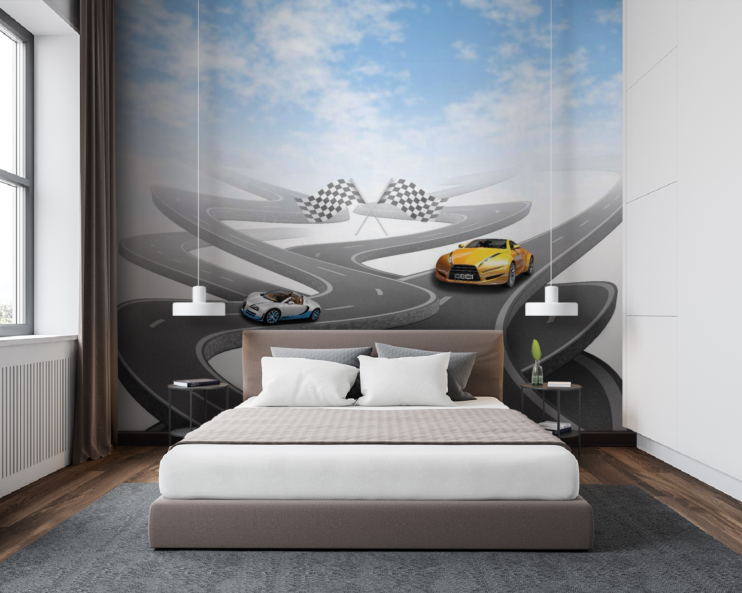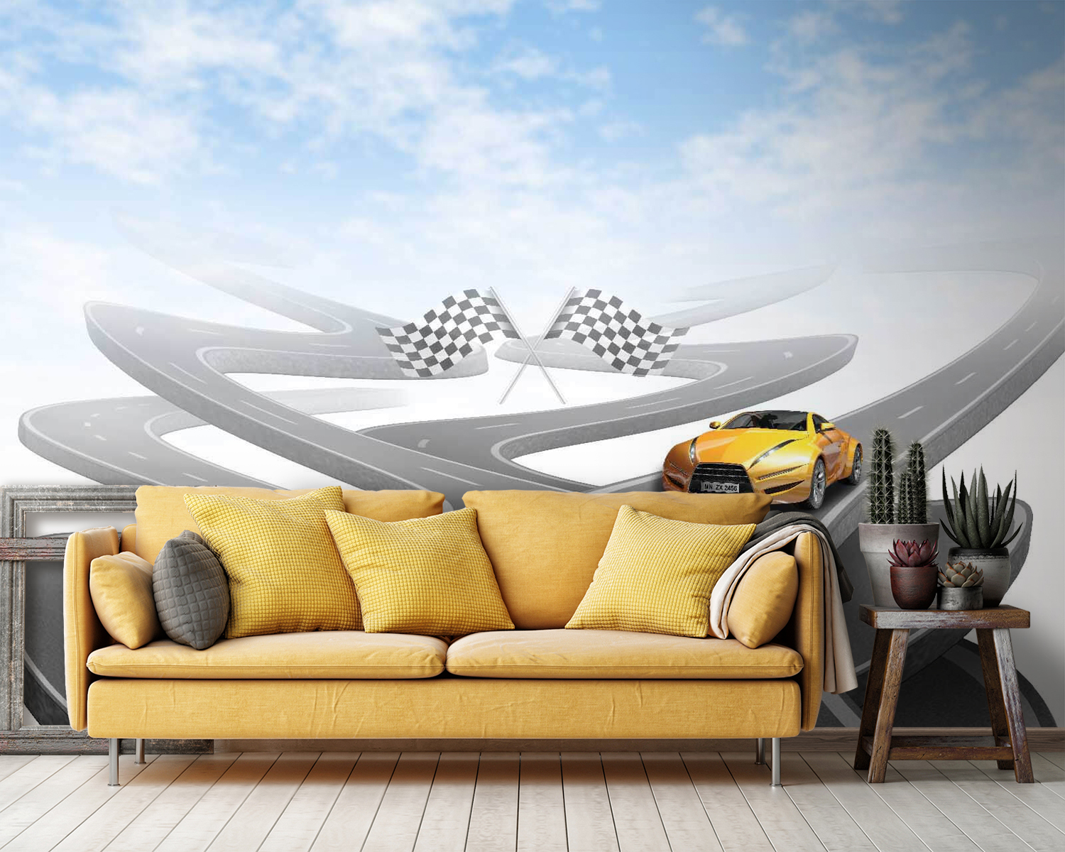Álmodozott már arról, hogy egy mutatós sportautóval száguldozzon végig a kanyargós utakon? Ez a falfestmény gondoskodik rólad! Egy élénksárga sportkocsit ábrázol egy végtelennek tűnő, kanyargós úton, egy olyan kék égbolt alatt, hogy a falaidat is életre keltheti. Tökéletes az autórajongóknak, a versenyzős kalandokról álmodozó gyerekeknek, vagy bárkinek, aki szeret egy csipetnyi izgalmat a dekorációjában. Képzeld el, milyen történeteket mesélhetnél, például száguldozhatnál a hegyeken át, vagy cirkálhatnál a tengerparti autópályákon a széllel a hajadban. Olyan ez, mint egy mini kiruccanás, egyenesen a faladon!