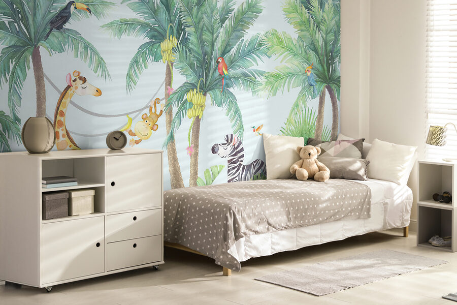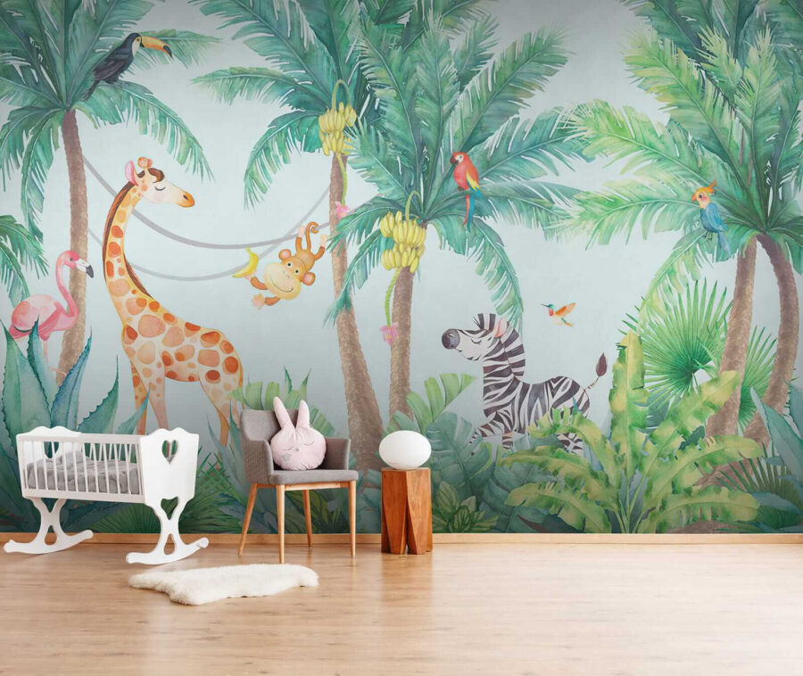Dobd fel a gyerekszobát ezzel a bájos “Falfestmények trópusi állatok élvezik a dzsungel hangulatát”! Képzeld el ezt a jelenetet: pimasz majmok lengnek a liánokon, egy barátságos zsiráf és egy zebra, amely szuper lazának tűnik – mindezt buja, zöld pálmák veszik körül. Olyan, mintha egy mini dzsungelszafari lenne otthon! Tökéletes a természet és az állatok iránti szeretet kialakításához a kis felfedezőkben. És őszintén szólva, ki ne szeretne arra ébredni, hogy minden reggel egy flamingó üdvözli? Ez a falfestmény örömöt és kalandot hoz, és minden helyiséget élettel telivé és boldoggá varázsol.
