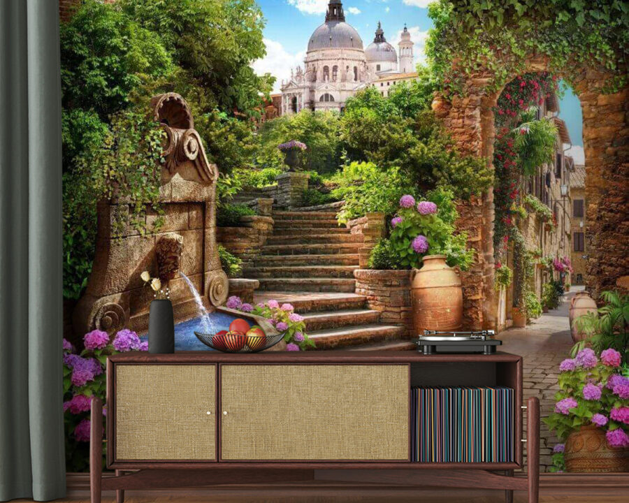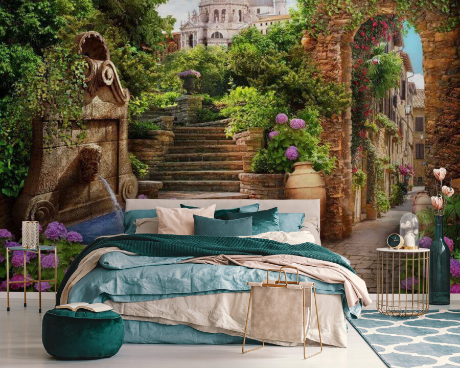 Bármilyen teret álomszerű meneküléssé varázsolhatsz ezzel a varázslatos falfestménnyel, amely egy nyugodt kőösvényt, pezsgő szökőkutat és vibráló virágokat ábrázol. Képzelje el, hogy egy hangulatos európai üdülőhelyre léphet közvetlenül a nappalijából vagy a hálószobájából. A nyugtató vízhangok szinte hallani fogja a szelíd fodrozódást, míg a színes virágok vidámságot varázsolnak a tájba. Olyan, mintha megtalálná egy festői falu rejtett zugát, amely csak arra vár, hogy inspirálja a következő kalandját. Tökéletes egy csobbanásnyi báj, minden pillantásával álmodozásra hív. Ki ne szeretne kávét kortyolni ennél a szökőkútnál? Melegség és szeszély, egyetlen elbűvölő darabban.