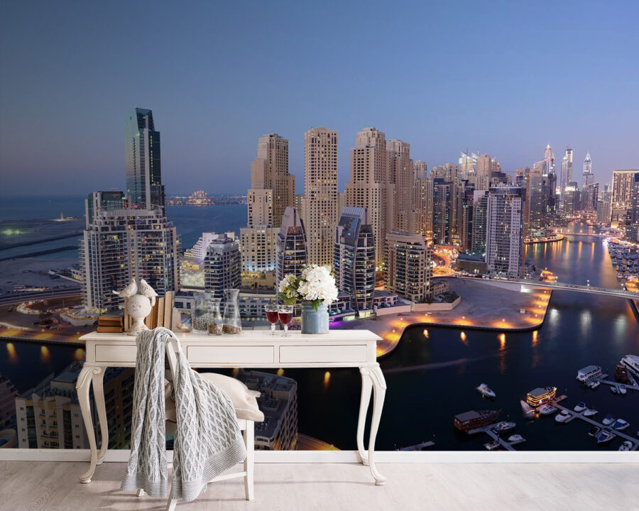 Ragadjon meg egy szeletet a városi varázslatból ezzel a magával ragadó falfestménnyel, amelynek címe “Egy épület nagy látószögű nézete”. Képzelje el, hogy belép a helyiségébe, és azonnal egy nyüzsgő városképbe kerül, ahol a karcsú felhőkarcolók találkoznak a nyugodt vízparttal. Tökéletes az építészet szerelmeseinek, vagy azoknak, akik egyszerűen csak az elegáns, modern esztétikát kedvelik. A fények lágyan pislákolnak, miközben a város alattunk pezseg az élettől – igen, ennyire hangulatos.