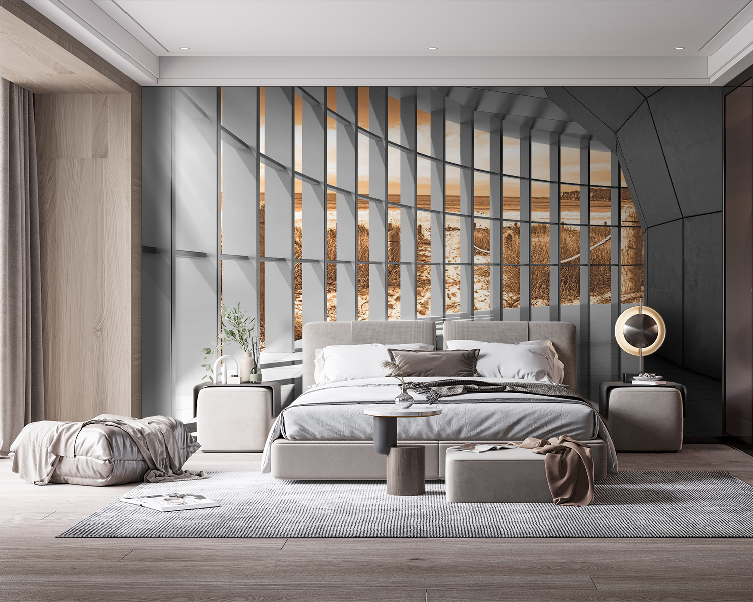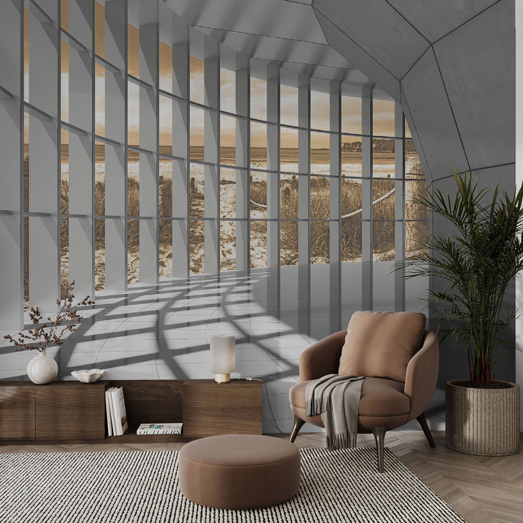 Változtasson át bármilyen teret a fény és a perspektíva paradicsomává ezzel a lenyűgöző falfestménnyel. Képzelje el, hogy egy hatalmas, ablakokkal teli szobába lép, amelyek mindegyike arra hívja a napot, hogy táncot járjon a falakon. Az árnyékok művészi játéka meleg, meghitt érzést kelt, szinte olyan, mintha egy lusta délutánon puha takaróba burkolóznál. Ez a falfestmény tökéletes a beszélgetések szítására – a vendégek úgy fogják érezni, mintha egy álomszerű helyre kerültek volna, miközben a kávéjukat kortyolgatják. Legyen szó nappaliról, hálószobáról vagy kreatív stúdióról, ez a falfestmény egy csipetnyi bájt és menekülést kölcsönöz a mindennapi pillanatoknak, és egy kicsit különlegesebbé teszi azokat. Ráadásul ki ne szeretné a szabad kilátást, amikor bent ragad a lakásban?