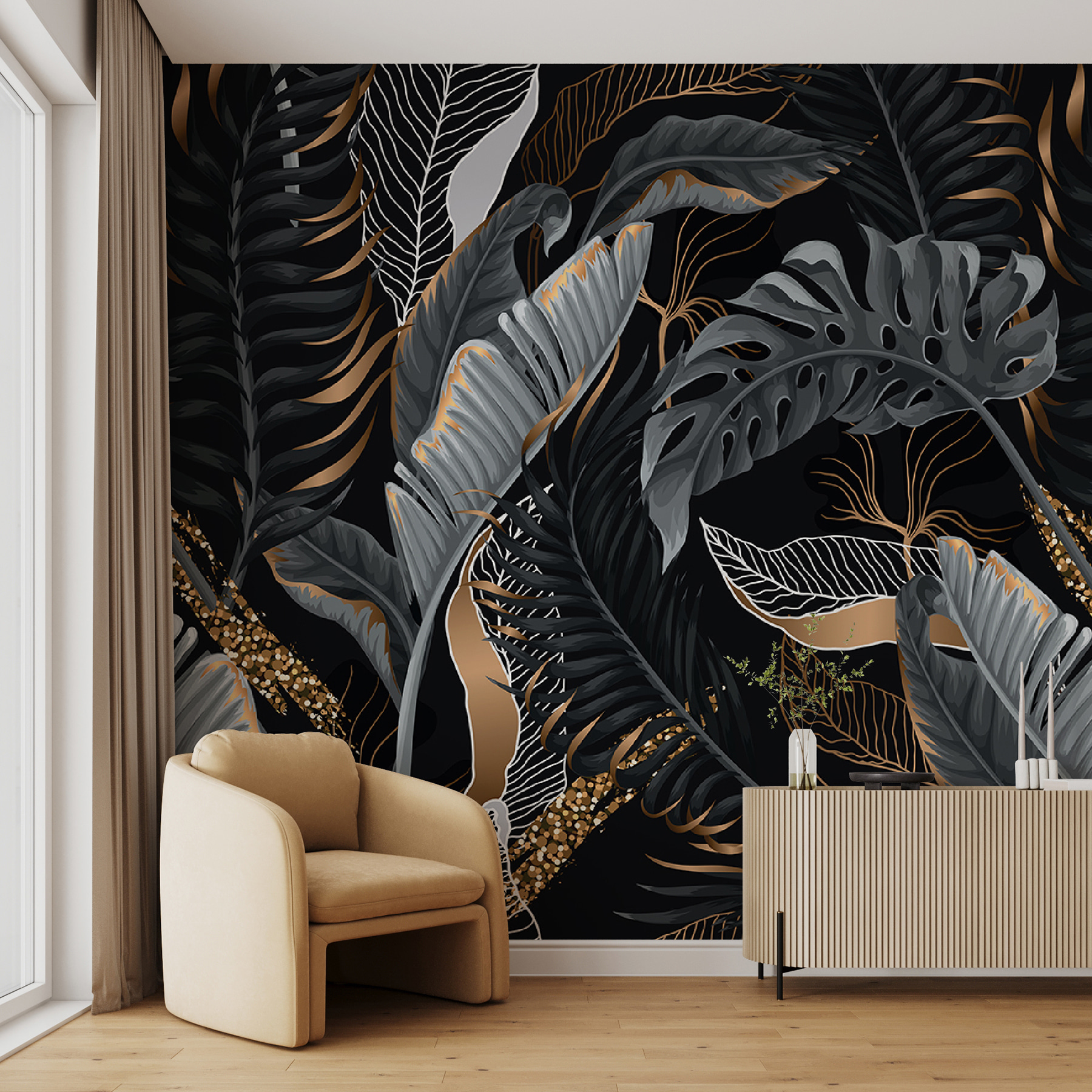 Alakítsa át terét ezzel a lenyűgöző freskóval, amely elegáns trópusi leveleket ábrázol sötét háttéren. Képzelje el, hogy minden nap ezekkel a buja zöldekkel körülvéve ébred, mintha egy nyugodt erdőbe lépett volna – nos, a bogarak nélkül! Tökéletes a hívogató, otthonos hangulat megteremtéséhez. Képzelje el a lusta hétvégéket kávét kortyolgatva, miközben ezeknek a bonyolult leveleknek a szépségében sütkérezik. A sötét és a világos kontrasztja drámaiságot kölcsönöz anélkül, hogy elnyomná; olyan, mintha a természet úgy döntött volna, hogy egy elegáns kis partit rendez a faladon. Remekül illik nappaliba, hálószobába vagy abba a csendes olvasósarokba, amelynek csak egy kis extra hangulatra van szüksége. Miért érné be egyszerűvel, amikor egy mini dzsungeles menekülésben lehet része?