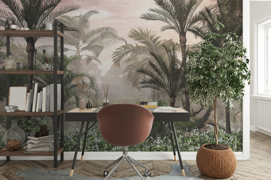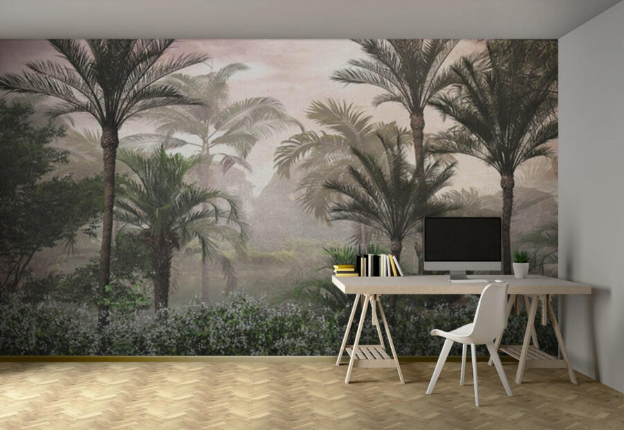 “Derűs reggel a trópusi paradicsomban” falfestmény – hát nem hívogató ez a név? Képzelje el, hogy erre a békés jelenetre ébred, közvetlenül a nappalijában. Élénk zöldek, finom virágok, és azok a magasra törő pálmafák, mindezek lágy reggeli ködbe burkolózva. Olyan, mintha a saját privát dzsungelébe lépne, anélkül, hogy elhagyná a kanapéját.
