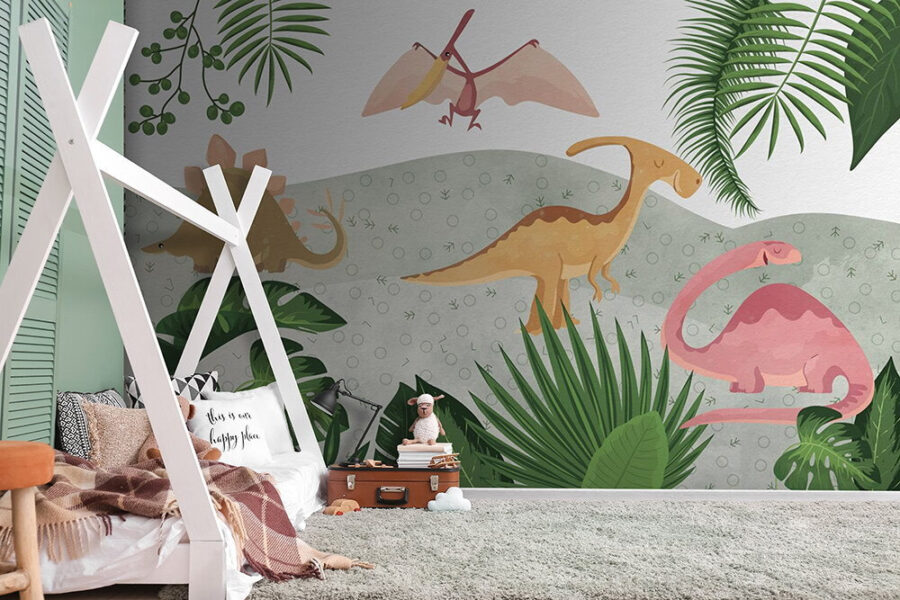 Varázsolja gyermeke szobáját dinoszauruszok csodás világává ezzel a bájos „Dinoszauruszok és levelek faliképpel”. Képzelje el, ahogy a kis felfedezők felnéznek a játékos növényevőkre és a pimasz repülő pteroszauruszra – fantáziájuk szárnyra kap! Ez több, mint egy falikép; ez egy történet, amely arra vár, hogy egy kíváncsi elme kibontakoztassa. Minden dinoszaurusz szinte élni látszik, készen arra, hogy cselekvésbe lendüljön. A megnyugtató zöldek és a lágy pasztell tónusok nyugodt hangulatot kölcsönöznek, mintha egy őskori paradicsom kis sarkában lennénk. Ez a falikép nem csupán dekoráció, hanem kalandra invitál és örömöt csempész minden szobába. Tökéletes a kreativitás inspirálására, és valljuk be – ki ne szeretne barátságos dinoszauruszok között ébredni?