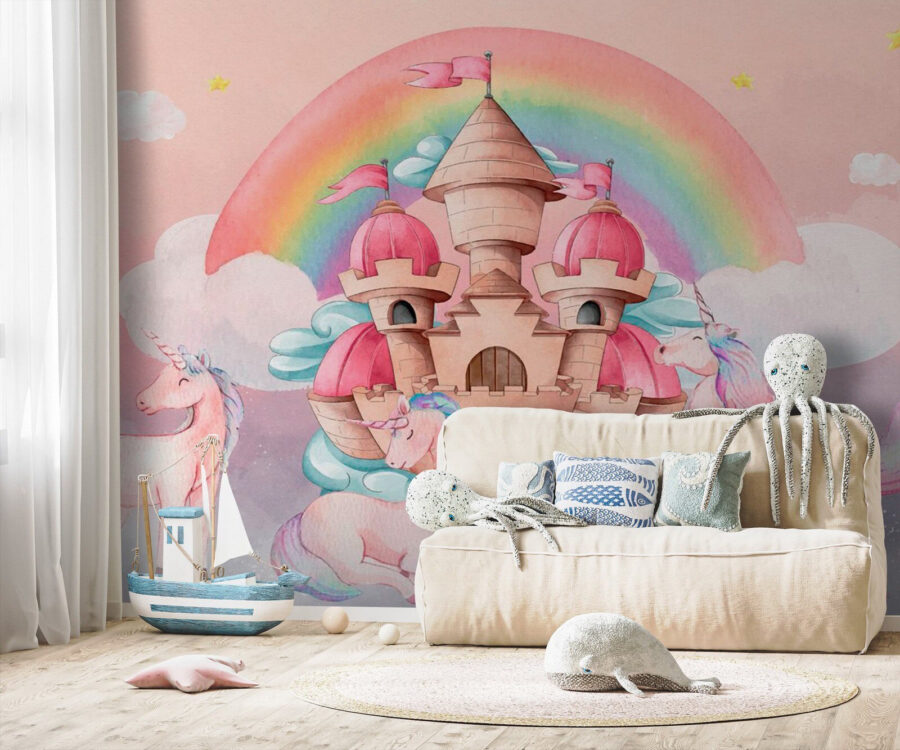 A bájos részletek – mint például az egyik egyszarvú kosara, amelyet az egyik unikornis lazán cipel – olyan játékosságot kölcsönöznek a képzeletnek, amely beindítja a fantáziát. Elképzelhetünk egy álomszerű teadélutánt közvetlenül a kastély mellett, csillogó csillagokkal és pelyhes felhőkkel teli égbolt alatt. A gyengéd pasztellszínek felmelegítik a szívet, így a freskó hangulatos és barátságos asztaldísz lesz. Ez nem csupán fali dekoráció; ez egy kapu az álmodozásokhoz és kalandokhoz.