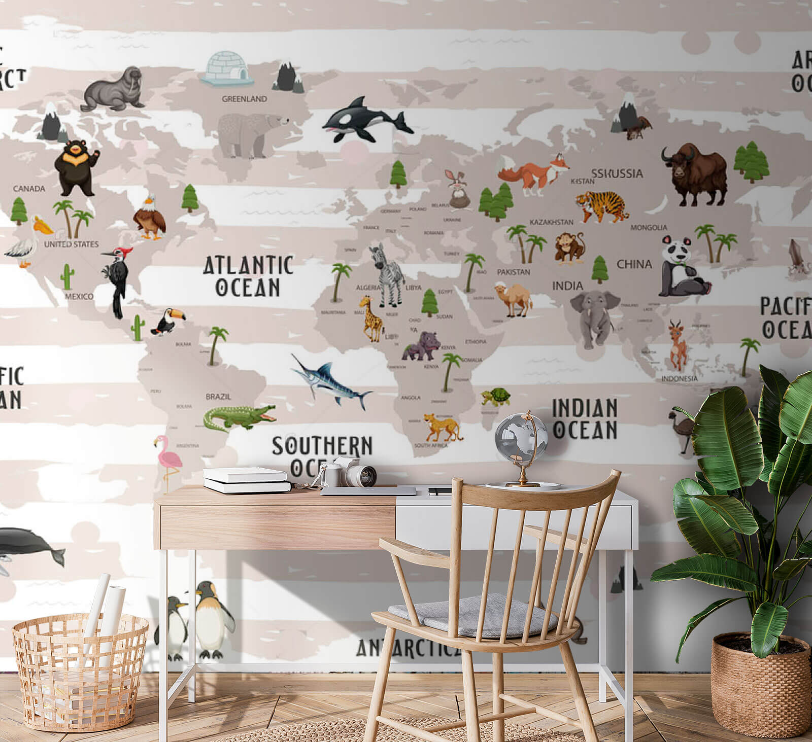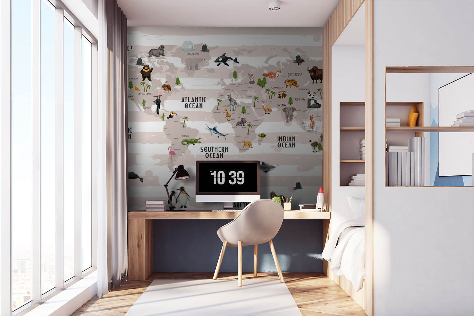 Varázsoljon bármelyik szobát miniatűr globális kalanddá ezzel a varázslatos faliképpel, amelyen a világtérképet kedves állatok díszítik. Képzelje el, hogy egy mosolygó panda és egy fenséges oroszlán között ébred fel – micsoda remek kezdete a napnak! A játékos illusztrációk felkeltik a kíváncsiságot, így fantasztikus középpontot képeznek a gyerekszobákban, vagy akár egy otthoni iroda különleges pontjaként is. Ráadásul remek beszélgetésindító is: a vendégek anélkül „utazhatnak” a világban, hogy a csomagolással kellene bajlódniuk. Mintha szafari lenne a falán – bogarak nélkül! Ez a tapéta tökéletes azok számára, akik nagy álmokat dédelgetnek és gyakran utaznak, és egy kis fantáziát csempész a mindennapokba. Kezdődjön a kaland!