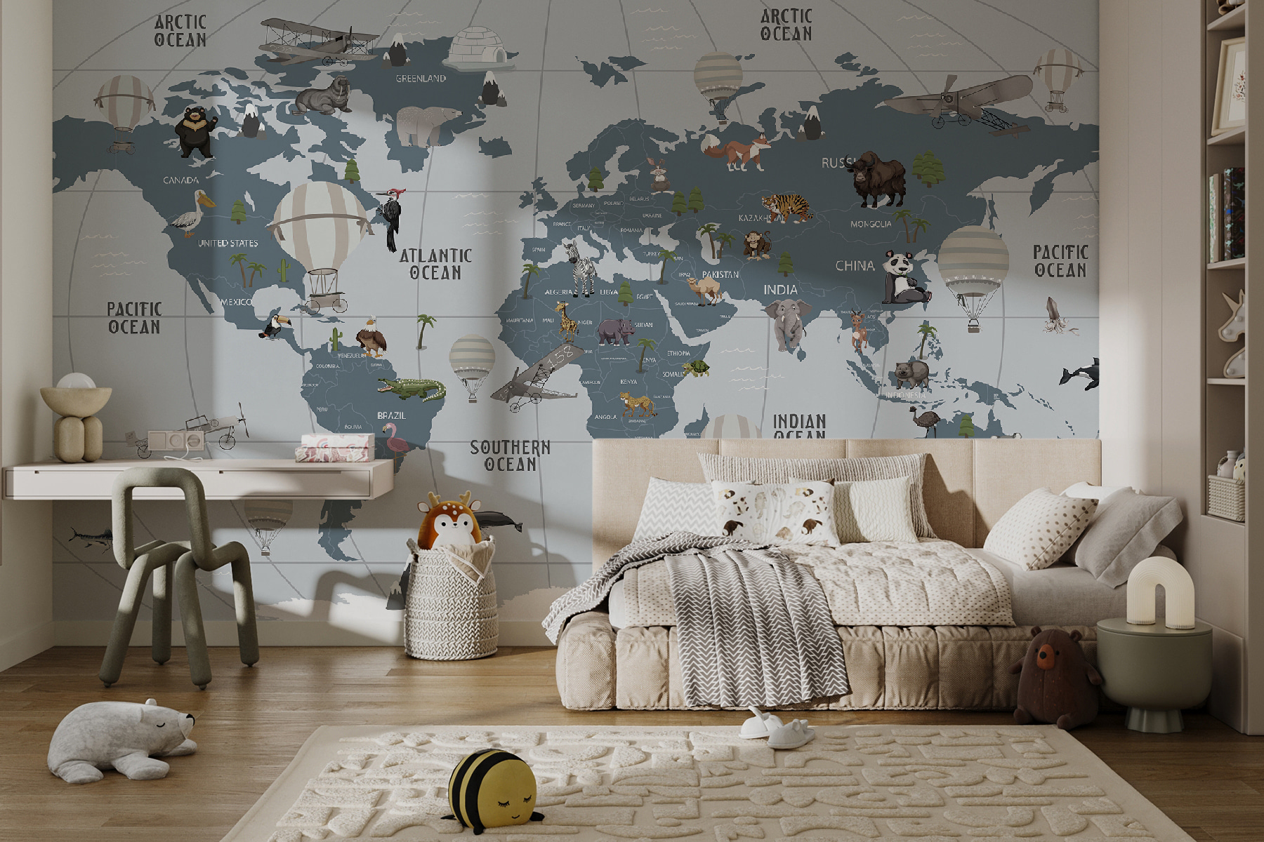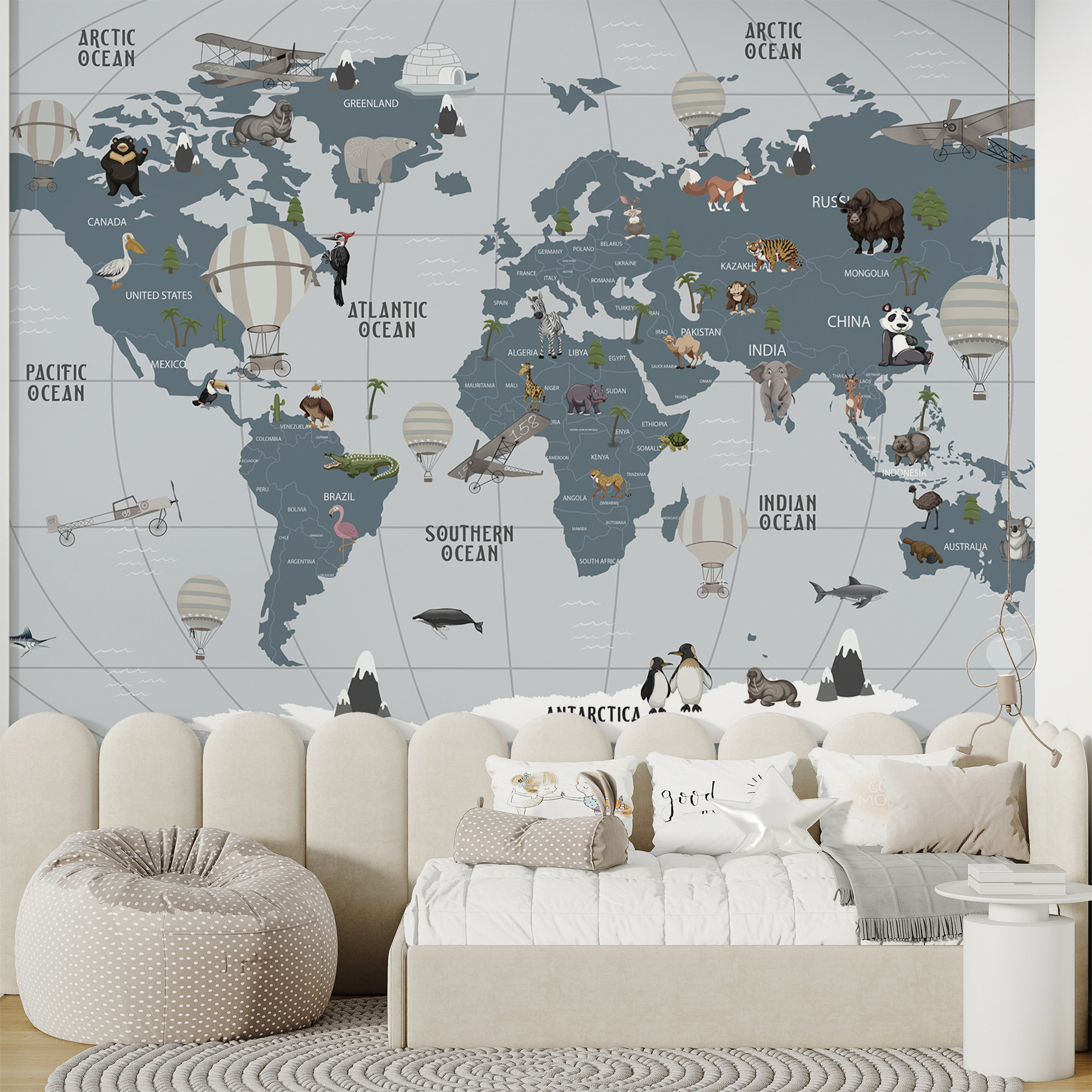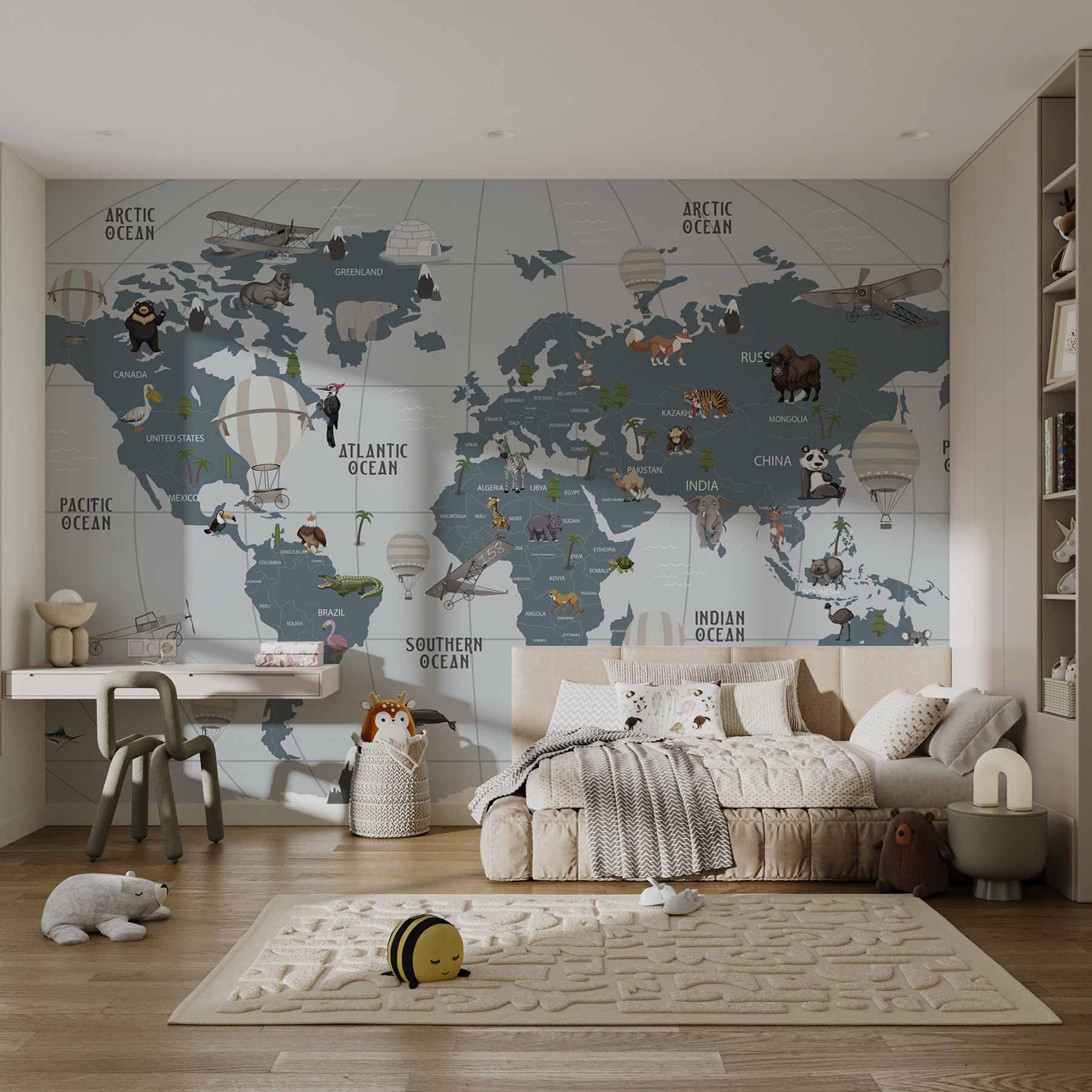 Képzelj el egy olyan világot, ahol a kalandok magasra szárnyalnak, mindezt a szobád kényelméből. Ez a “Hőlégballon az égben” falfestmény olyan, mint egy jegy a vándorláshoz, tökéletes a kis felfedezőknek és az álmodozóknak egyaránt. A játékos térkép felett lebegő bájos hőlégballonok segítségével a gyerekek beutazhatják a világot anélkül, hogy valaha is táskát pakolnának. Képzeld el a kacagást és az izgatottságot, amint dzsungeleket, óceánokat és szőrös barátokat mutatnak. Ez nem csak dekoráció; ez egy inspiráló háttér a történetekhez, a nevetéshez és a fantázia megszórásához. A falak ablakokká válnak távoli tájakra, és ki ne szeretné ezt? Tökéletes gyerekszobába vagy játszószobába, melegséget és szeszélyességet kölcsönöz. Kezdődjenek a kalandok!