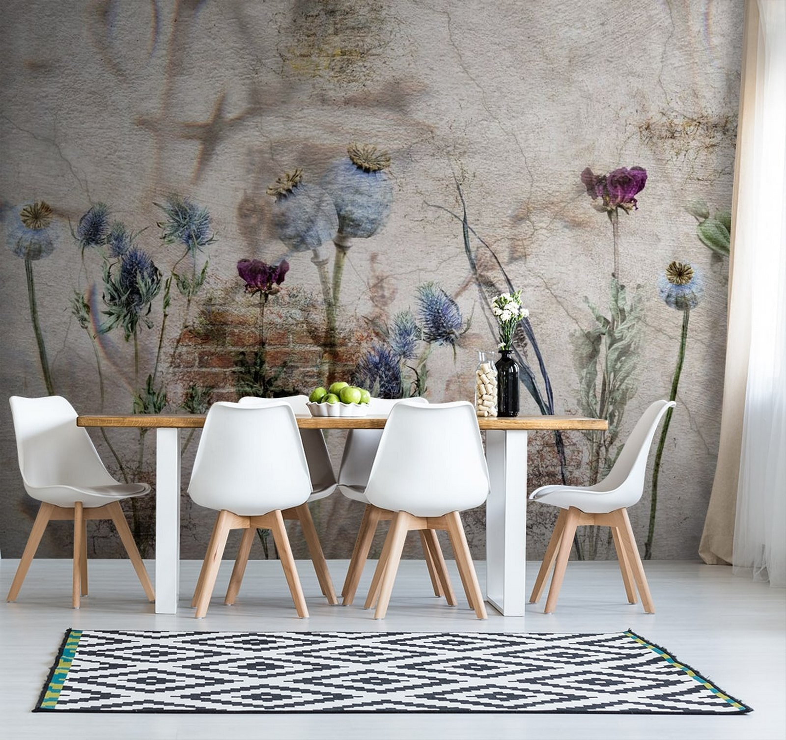 Alakítson át bármilyen teret ezzel a lenyűgöző falfestménnyel, amely egy botanikai kollázst ábrázol egy gyönyörűen rétegzett háttéren. Képzelje el, hogy egy olyan szobába lép be, ahol a finom virágok lágyan táncolnak a vintage báj suttogása mellett. A fakó színek nyugalmat idéznek, meghívva Önt egy kis szünetre és mély lélegzetvételre. Olyan, mintha egy kis kertet hoznál be a házba, minden öntözés nélkül. Ez a falfestmény tökéletes egy hangulatos zugba vagy egy csupasz falra, amely személyiségért könyörög, és mélységet és melegséget kölcsönöz. Nem csak dekoráció; hangulatot, hangulatot, finom emlékeztetőt ad, hogy lassítson és értékelje a természet művészetét.
