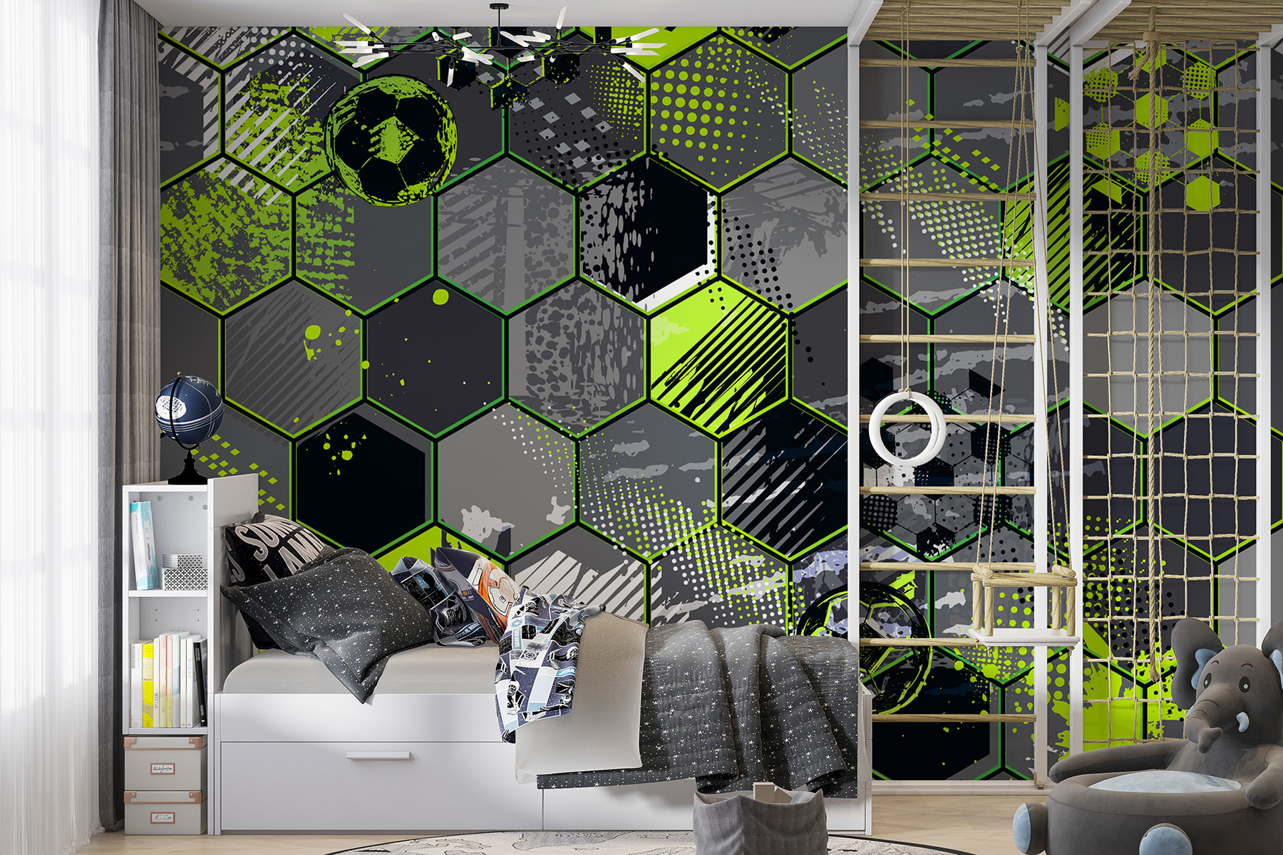 A mintának van ez a funky hatszögletűsége, neonzöld és elegáns szürke színfoltokkal. Olyan, mintha egy focipálya ütközött volna a modern művészettel. Tökéletes mindenkinek, aki szereti a csipetnyi mókát és a stílusfröccsöt a dekorációjában. Ez nem csak egy tapéta – ez egy nyilatkozat. Képzeld el: felébredsz, felhörpinted a kávét, és minden alkalommal, amikor elsétálsz mellette, egy kis boldogságrázkódást kapsz. Remek beszélgetésindító, amikor a barátok átjönnek, és megkérdezik: “Honnan szerezted ezt?”.