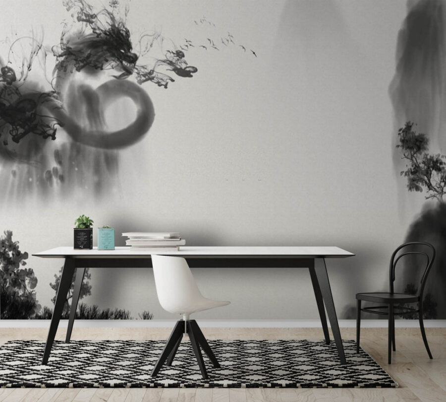 Nézd meg ezt a menő falfestményt fekete-fehérben! Olyan, mint a klasszikus és a művészi keveréke. Képzeld el, hogy belépsz egy szobába, és ez a titokzatos, szinte álomszerű jelenet fogad. Olyan a megjelenése, mintha füstös tinta kavarogna a papíron, és tájképek és absztrakt formák keverednének össze.