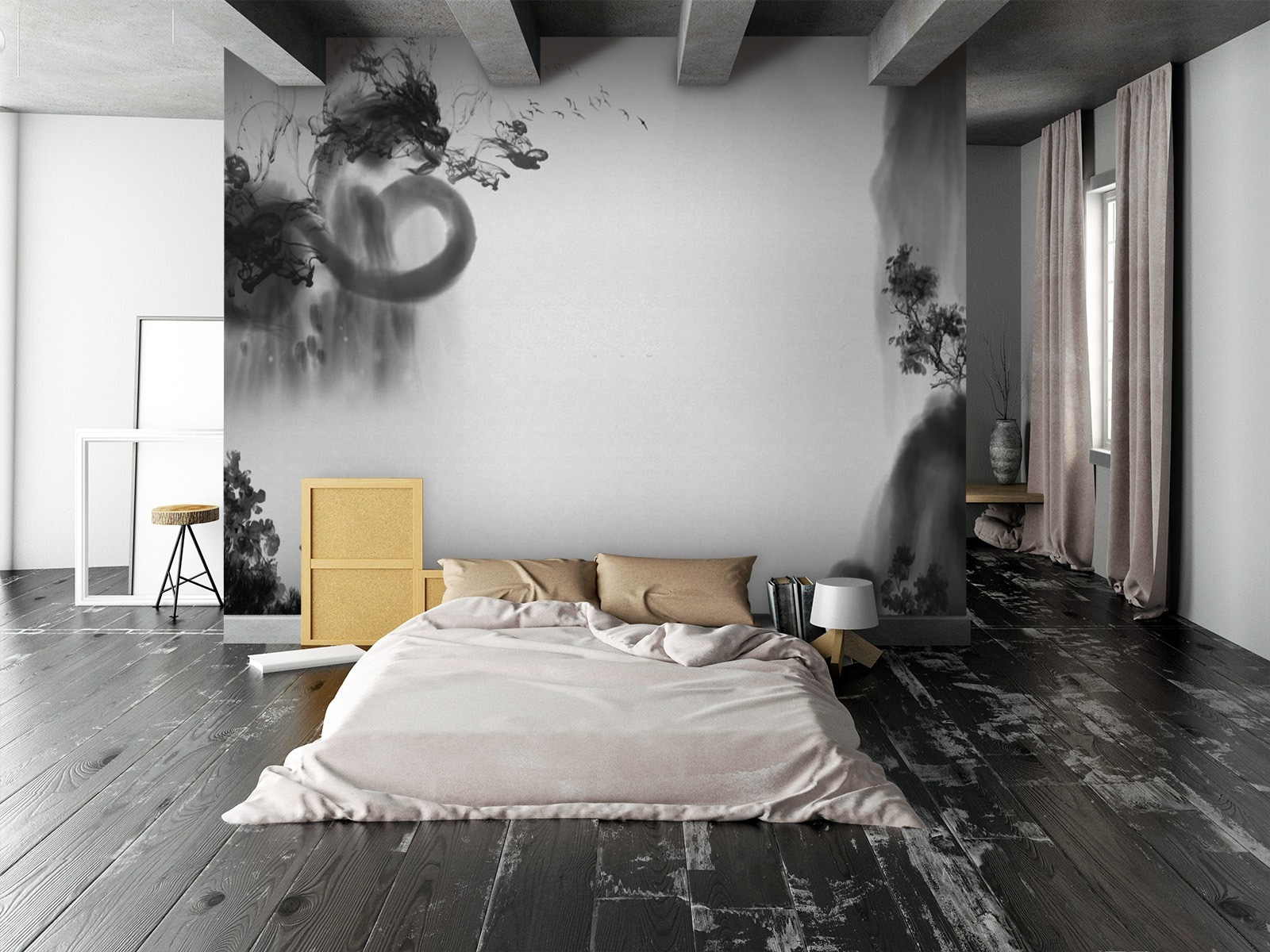 Nézd meg ezt a menő falfestményt fekete-fehérben! Olyan, mint a klasszikus és a művészi keveréke. Képzeld el, hogy belépsz egy szobába, és ez a titokzatos, szinte álomszerű jelenet fogad. Olyan a megjelenése, mintha füstös tinta kavarogna a papíron, és tájképek és absztrakt formák keverednének össze.