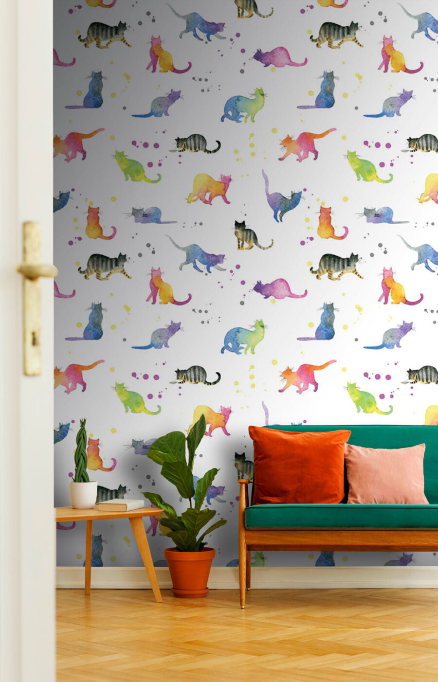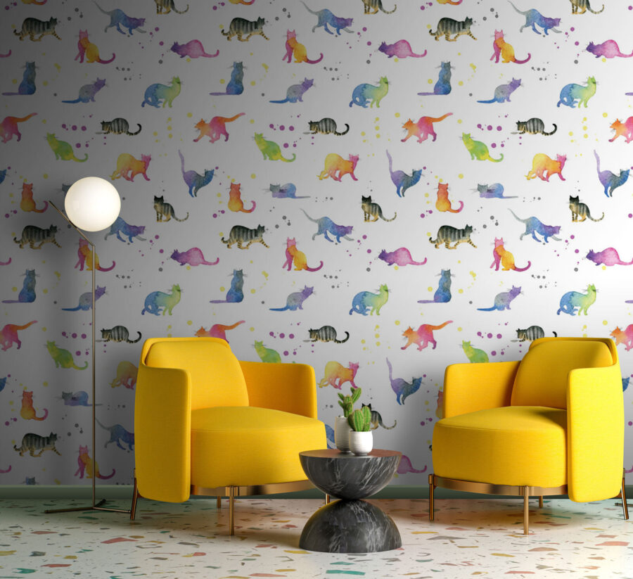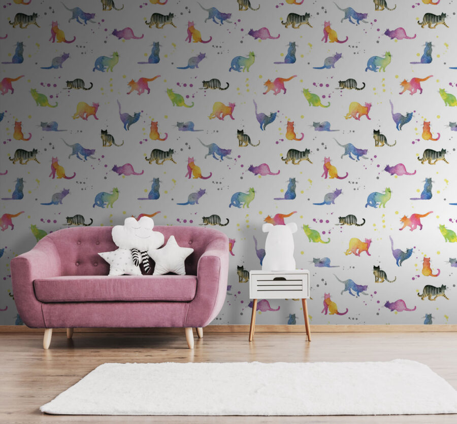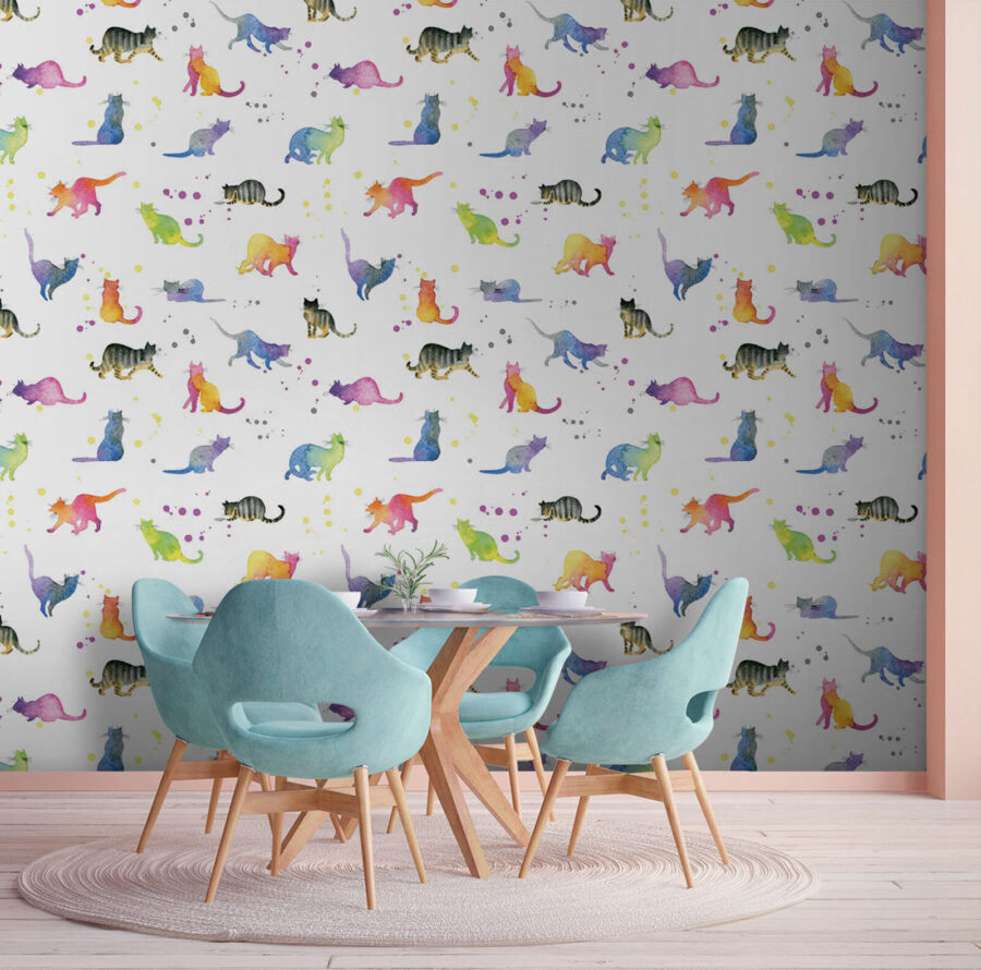Bármelyik falat varázsolhatja el egy szeszélyes, akvarell macskákkal teli dzsungellé, amely még a legmorcosabb macskát is dorombolni fogja! Ez a falfestmény tele van színekkel és macskás hangulattal, játékos bajuszokkal és csábító farkakkal. Képzelje el, hogy belép egy szobába, ahol minden pillantás egy új macskás barátot tár fel, aki készen áll arra, hogy felvidítsa a napját. A szelíd árnyalatok keveréke nyugodt érzést kelt, tökéletes egy hangulatos olvasósarokhoz vagy egy szokatlan gyerekszobához. Olyan, mintha minden nap macskákkal ölelkezne – anélkül, hogy macskaszéket kellene tisztítania! Akár macskabarát, akár csak szereti a vidám dekorációt, ez a falikép biztosan elvarázsol mindenkit, aki meglátogatja.