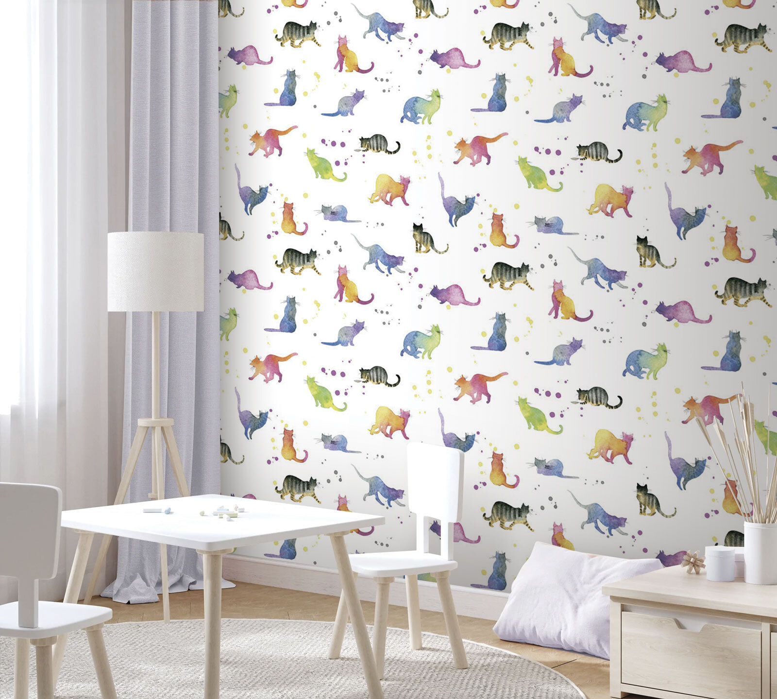 Bármelyik falat varázsolhatja el egy szeszélyes, akvarell macskákkal teli dzsungellé, amely még a legmorcosabb macskát is dorombolni fogja! Ez a falfestmény tele van színekkel és macskás hangulattal, játékos bajuszokkal és csábító farkakkal. Képzelje el, hogy belép egy szobába, ahol minden pillantás egy új macskás barátot tár fel, aki készen áll arra, hogy felvidítsa a napját. A szelíd árnyalatok keveréke nyugodt érzést kelt, tökéletes egy hangulatos olvasósarokhoz vagy egy szokatlan gyerekszobához. Olyan, mintha minden nap macskákkal ölelkezne – anélkül, hogy macskaszéket kellene tisztítania! Akár macskabarát, akár csak szereti a vidám dekorációt, ez a falikép biztosan elvarázsol mindenkit, aki meglátogatja.