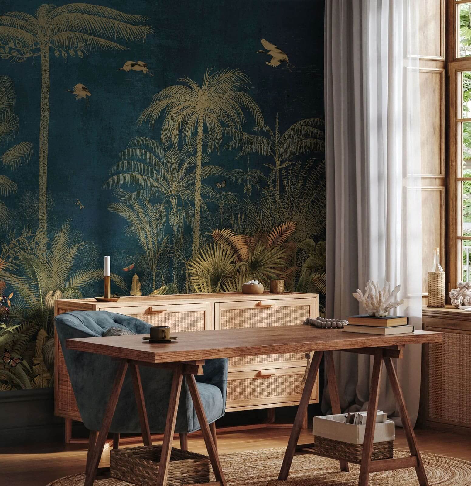 Transform your space with this stunning wall mural, where lush palm trees and cheerful birds come alive against a dreamy backdrop. Imagine walking into a room that feels like a tropical escape—seriously, who needs a vacation with this beauty on the wall? The rich hues and intricate details create a calming vibe, perfect for a cozy reading nook or to liven up any dull wall. It’s like bringing a slice of nature indoors, minus the mosquito bites. Friends will wonder if you hired a fancy decorator—little do they know, it’s just this mural making the magic happen!