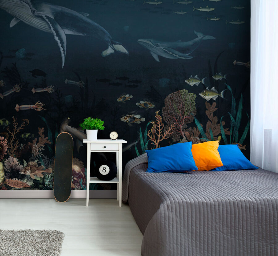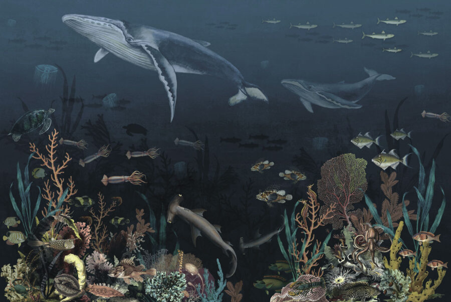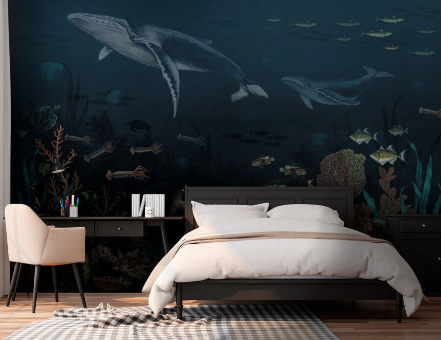Merülj el a csodák világába ezzel a lenyűgöző falfestménnyel, melyen bálnák siklanak kecsesen a mélységben! Képzeld el – belépsz a szobába, és bumm, ott úszik egy fenséges bálna színes halak, tengeri teknősök és vibráló korallok mellett. Azonnal a nyugalom és a kaland érzetét kelti. Tökéletes egy gyerekszobába vagy egy tengerparti ihletésű térbe, ez a falfestmény beindítja a képzeletet, és óceáni szökésekről álmodozik. Képzelje el, milyen történeteket mesélhetne! Akár játékidő, akár meghitt lefekvés, ez a falfestmény számtalan vízi kaland helyszínéül szolgál – és ki ne szeretné ezt a varázslatot a falán? Úgy fogod érezni, mintha egy kis darabka óceán lenne otthonodban.