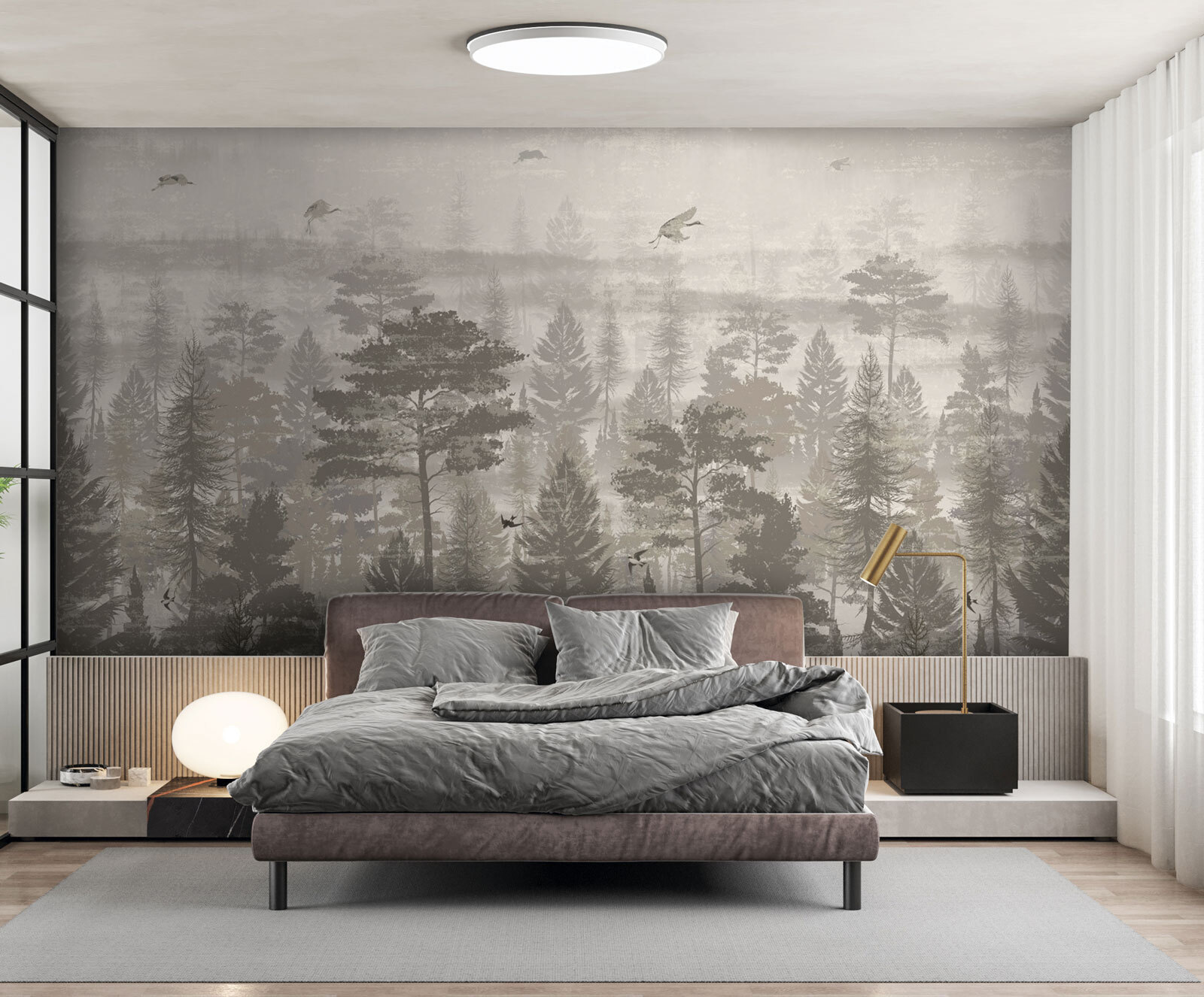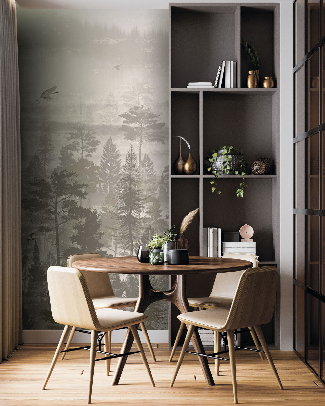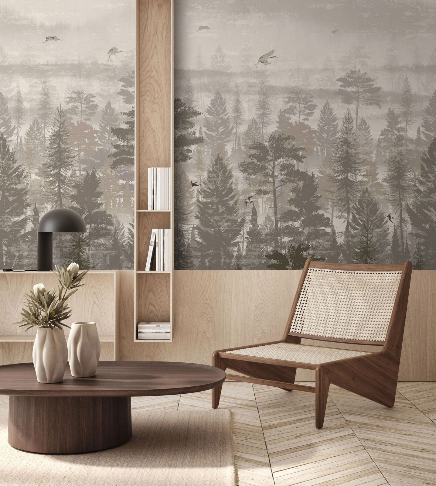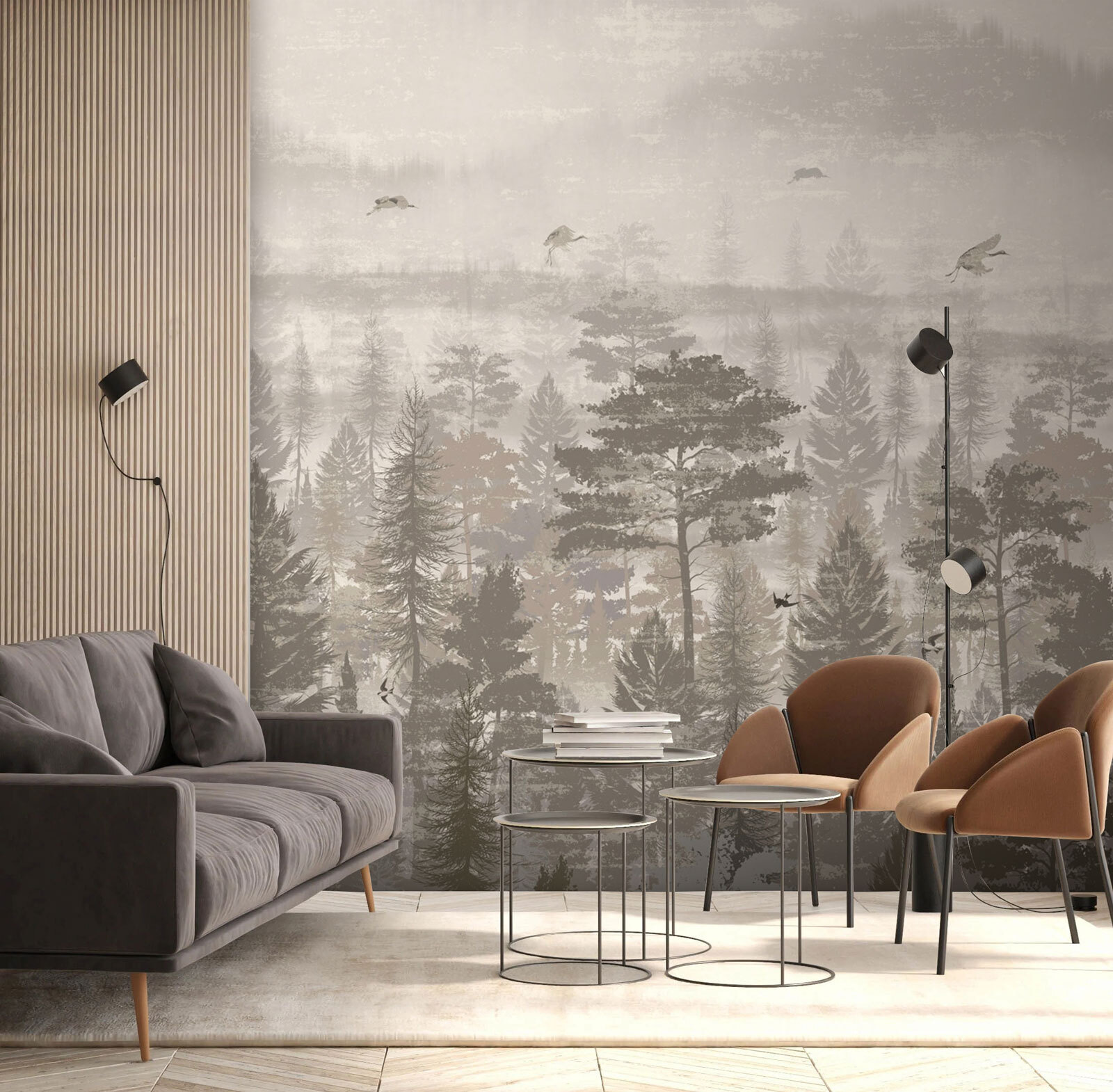 Transform your space with this stunning mural of birds flying over a tranquil forest. It’s like having a slice of nature right in your living room—minus the mosquitoes, of course. The soft, muted colors evoke a calming vibe, making it the perfect backdrop for cozy moments, whether you’re sipping coffee or diving into a good book. Imagine waking up to this serene view, where every glance feels like a mini escape into the woods. It’s just the right touch for those who love a hint of adventure mixed with a splash of elegance. Perfect for any nature lover or anyone ready to elevate their decor game!