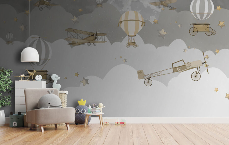 Képzelje el, hogy magasan szárnyal az álomszerű felhők és csillagok felett ezzel a varázslatos falfestménnyel. A “Vintage Aircrafts Soaring Through Stars” egy szeszélyes éjszakai égboltra repíti Önt, ahol a régi idők repülőgépei és hőlégballonjai csillogó csillagok között sodródnak. Tökéletes nosztalgikus hangulatot kölcsönöz bármely helyiségnek, és a gyerekek és felnőttek körében egyaránt nagy sikert arat. A kicsik úgy érezhetik, mintha éjszakai kalandokra indulnának, és remek társalgási darab egy vendégszobában is. A visszafogott színek sokoldalúvá teszik ezt a darabot – nyugtató, de mégis tele van bájjal és karakterrel. Álmodozó és elbűvölő, olyan, mint egy édes esti mese falfestmény formájában.