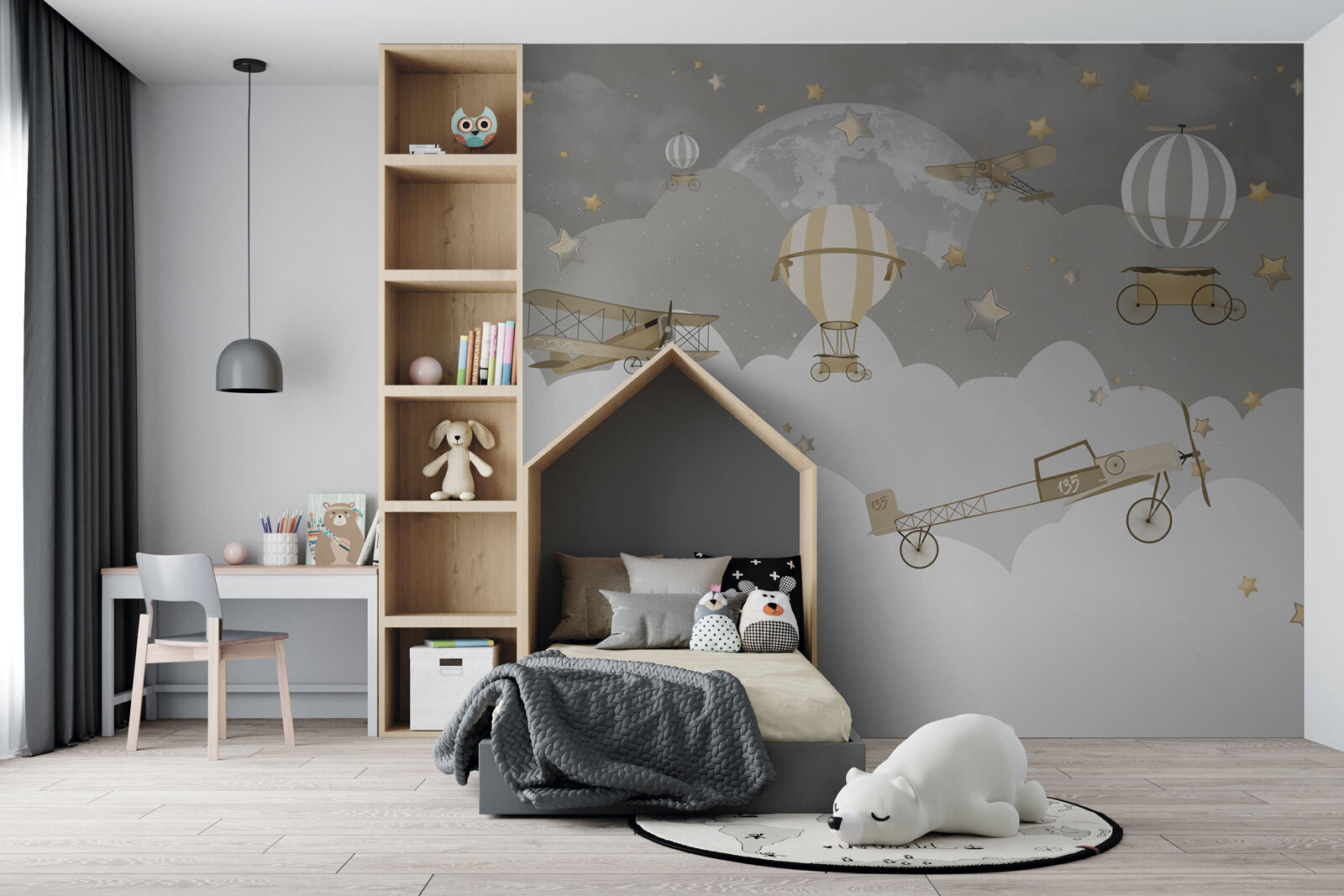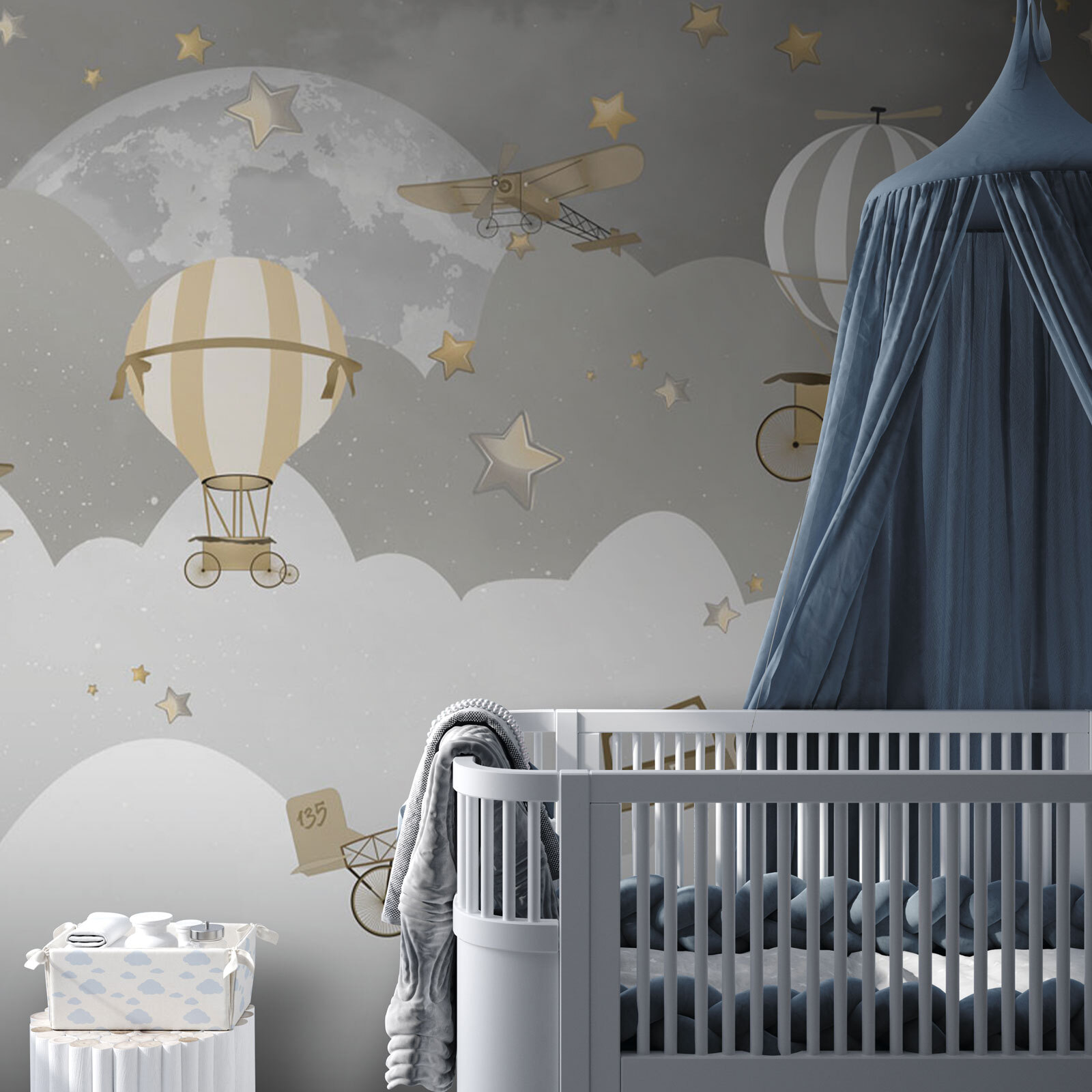 Képzelje el, hogy magasan szárnyal az álomszerű felhők és csillagok felett ezzel a varázslatos falfestménnyel. A “Vintage Aircrafts Soaring Through Stars” egy szeszélyes éjszakai égboltra repíti Önt, ahol a régi idők repülőgépei és hőlégballonjai csillogó csillagok között sodródnak. Tökéletes nosztalgikus hangulatot kölcsönöz bármely helyiségnek, és a gyerekek és felnőttek körében egyaránt nagy sikert arat. A kicsik úgy érezhetik, mintha éjszakai kalandokra indulnának, és remek társalgási darab egy vendégszobában is. A visszafogott színek sokoldalúvá teszik ezt a darabot – nyugtató, de mégis tele van bájjal és karakterrel. Álmodozó és elbűvölő, olyan, mint egy édes esti mese falfestmény formájában.
