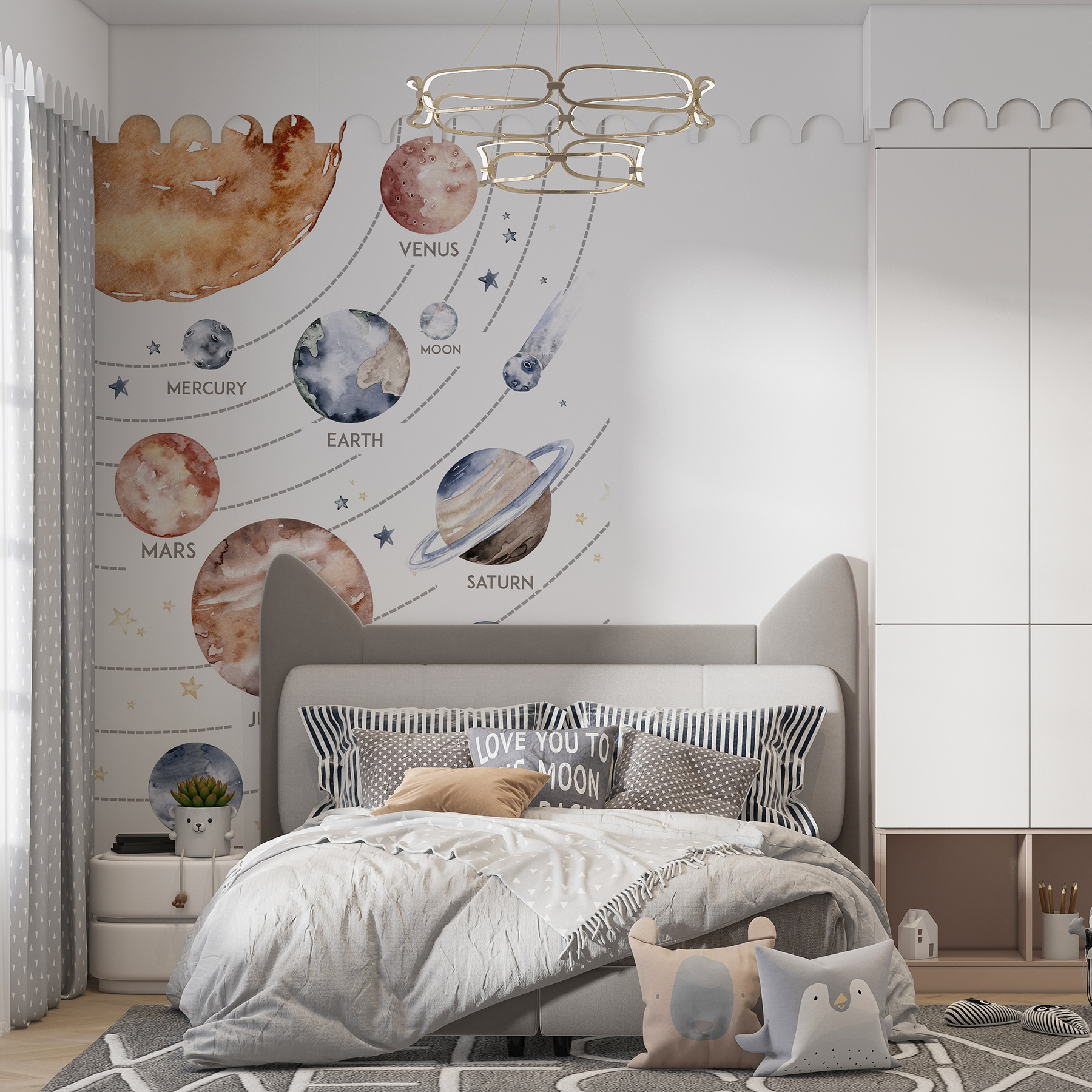 Képzeld el az álmos lefekvést a Szaturnusz gyűrűinek szelíd fénye alatt, vagy az élénk játékidőt a Merkúr és a Jupiter őrködésével. Ez a nyugtató művészi hangulat, ami egyszerűen jólesik – itt nincsenek merev, unalmas oktatási poszterek. Csak egy gyönyörű, egyedi darab, amely egy kis galaxis varázslatot hoz az otthonodba. Akár a gyerekszobát dobja fel, akár a játszószobát varázsolja el, ez a falfestmény kiváló választás. 🌟