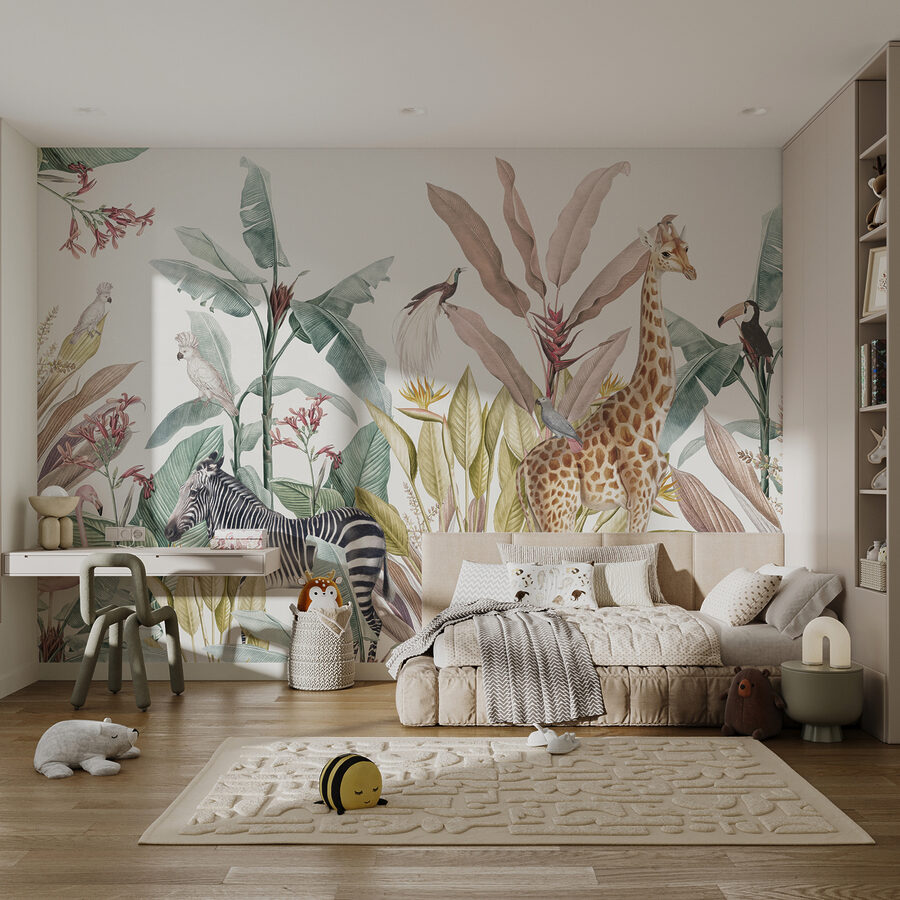 Egy gyors kirándulásra van szüksége a szavannára? A “Zsiráf madárral a hátán” falfestmény pont az, amire szüksége van. Ez a gyermek falfestmény tele van színekkel és barátságos szafari állatokkal, tökéletes arra, hogy beindítsa gyermeke fantáziáját. Egy mókás zsiráf áll magasan, hátán egy apró madárka ül – egy kellemes meglepetés pajtás! Egy zebra lazán falja a leveleket, és egy papagáj is bekukkant, pimasz humorral színesíti a képet. Olyan, mint egy játékos mesekönyv a falon, és bármelyik szobát mini kalanddá varázsolja. Fogj egyet, és hagyd, hogy gyermeked fantáziája szárnyaljon!