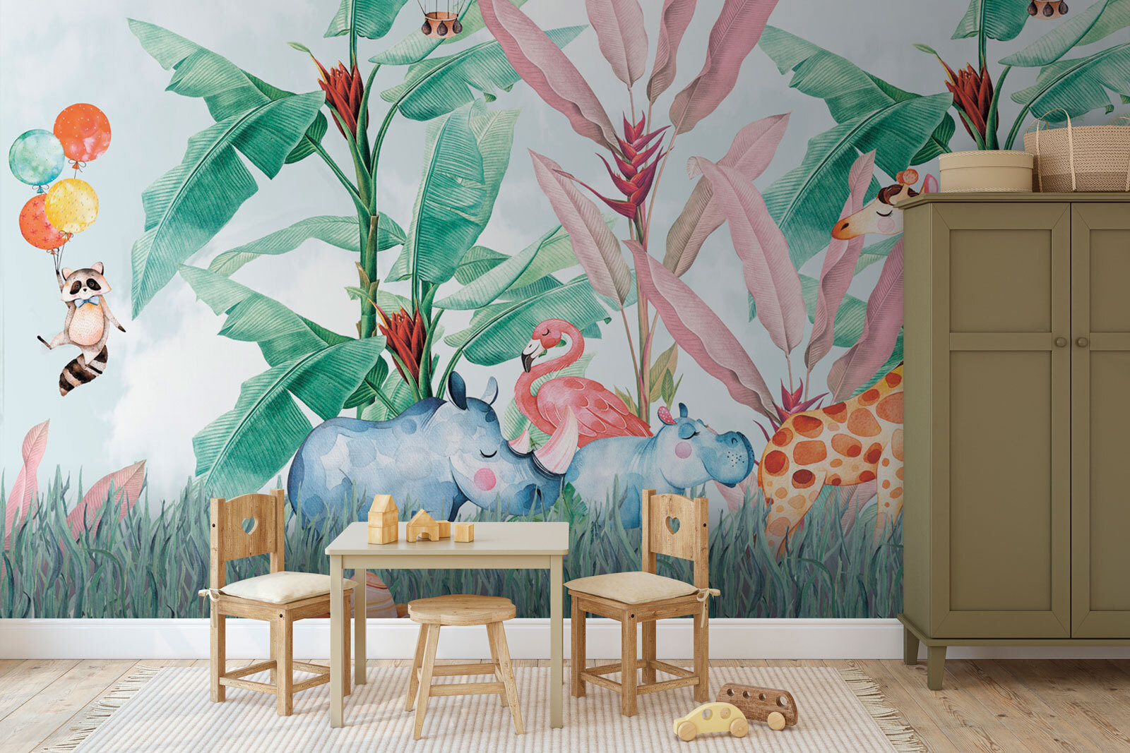 Bármelyik gyerekszobát varázsolja szeszélyes kalanddá ezzel a varázslatos falfestménnyel, amelyen egy csokornyakkendős mosómedve látható, aki játékos lufik között lebeg. Képzeld el az örömöt a kis arcokon, ahogy elmerülnek az állatok vibráló világában – a girifek, a zebrák és még egy nyugodt víziló is csak úgy lóg. A buja zöld növényzet és a pasztellszínek kreativitásra ösztönöznek, és beindítják a képzeletet. Ez nem csak dekoráció; ez egy kis meghívás a nagy álmokra. Képzelje el a mesemondást e bájos falfestmény alatt – van valami varázslatos abban, ha ilyen vidám társak veszik körül. Ez a falfestmény tökéletes gyerekszobákba vagy játszószobákba, melegséget és vidámságot kölcsönöz minden térnek, és felfedezésre ösztönzi a kíváncsi elméket. A falaid soha többé nem lesznek unalmasak, és ki tudja? Talán ez a mosómedve még beszélgetéseket is kezdeményez majd az állati kalandokról!