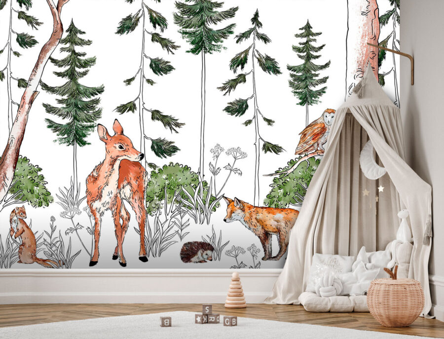 Varázsolja át bármelyik helyiséget ezzel a bájos faliképpel, amelyen erdőben élő állatok vidám társasága látható! Képzelje el egy nyugodt erdei jelenetet, ahol egy kíváncsi szarvas és egy játékos róka sétálgat a buja növényzet között. Egy bagoly figyel felülről, ami egy kis fantáziát ad a képhez. Mintha egy darabka természet lenne a falán. Ez a tapéta tökéletes egy hangulatos olvasósarokhoz vagy egy gyerekszobához, beengedi a szabad levegőt, és minden pillantást egy kis kalanddá varázsol. Terjessze az örömöt és a melegséget, és hagyja, hogy a mesemondás kibontakozzon a saját varázslatos erdőjében – ezekkel a szőrös barátokkal soha nem lesz unalmas!