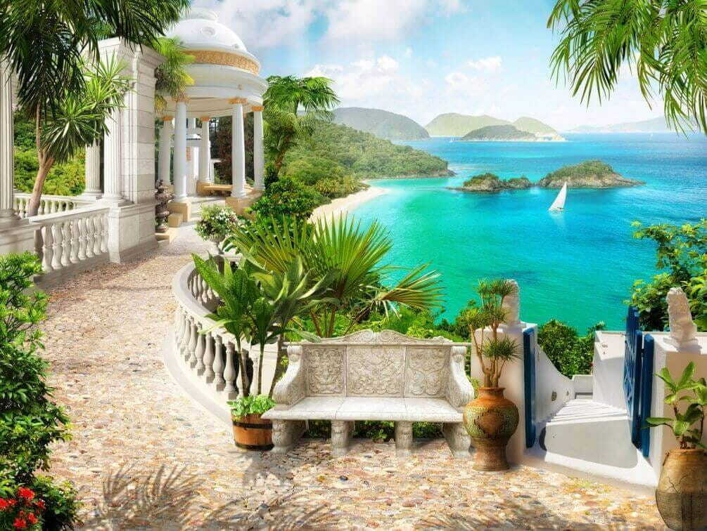 Képzelje el: belép a szobájába, és azonnal egy nyugodt tengerparti paradicsomba kerül. Pontosan ezt teszi a “Fali falfestmények növény egy cserépben”. Olyan, mintha egy mini nyaralóhely lenne közvetlenül a faladon. Azok a buja zöld növények, a békés fehér pavilon és a lélegzetelállító türkizkék víz – ez a tökéletes nyugalom!