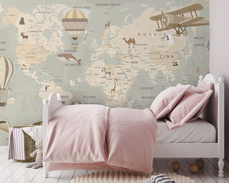 Képzelje el, hogy minden alkalommal, amikor belép egy szobába, egy kalandokkal teli világba lép. Ez a gyönyörűen illusztrált térkép fölött szárnyaló hőlégballonokat ábrázoló freskó távoli tájakról és varázslatos utazásokról való ábrándozásra hív. Élénk színeivel és bájos részleteivel olyan, mintha egy minivakáció lenne a falán. Képzelje el, ahogy a gyerekek vagy a barátok köré gyűlnek, és megmutatják azokat a helyeket, ahová szeretnének ellátogatni, vagy felidézik a megtett utazásokat. Ez nem csak egy dekoráció; ez egy beszélgetésindító! Ez a falfestmény tökéletes a játszószobába, az irodába vagy egy hangulatos olvasósarokba, örömet és kíváncsiságot okoz, és bármilyen teret egy kicsit szeszélyesebbé tesz. Ki ne szeretne egy léggömbön ellebegni, legalábbis képzeletben?