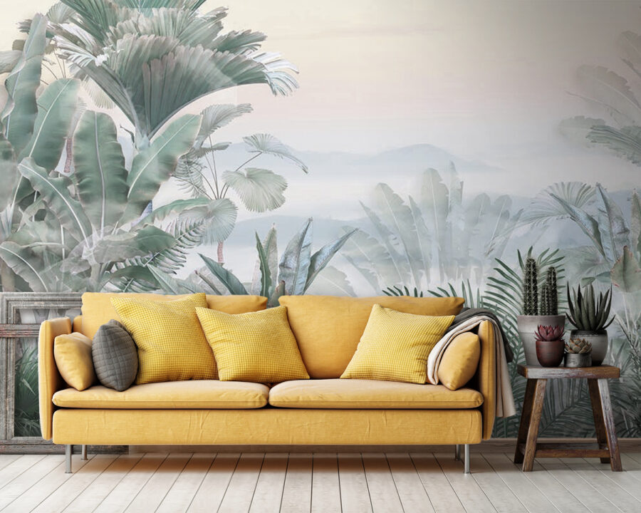 Az egyik legviccesebb dolog, ahogy a pálmalevelek egyszerűen beleolvadnak ebbe az álomszerű ködbe. Megvan a tökéletes egyensúlya annak, hogy feltűnő, mégis megnyugtató. És ha zöld hüvelykujjad van, vagy csak szereted a növényeket, de nem tudod életben tartani őket – ne aggódj! Ez a falfestmény egyetlen csepp víz nélkül is buja, trópusi hangulatot áraszt. Remekül alkalmas arra, hogy elmerülj a gondolataidban, és egy kis zent vigyél a mindennapok nyüzsgésébe.