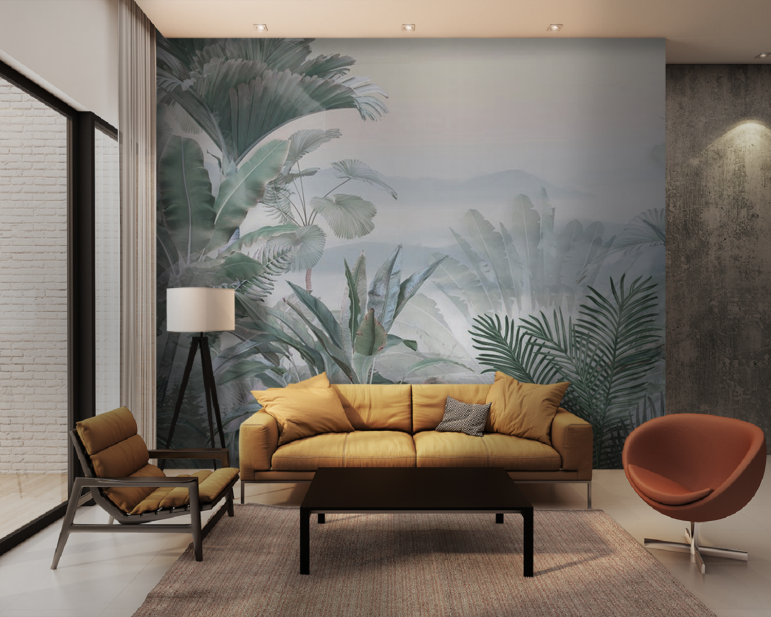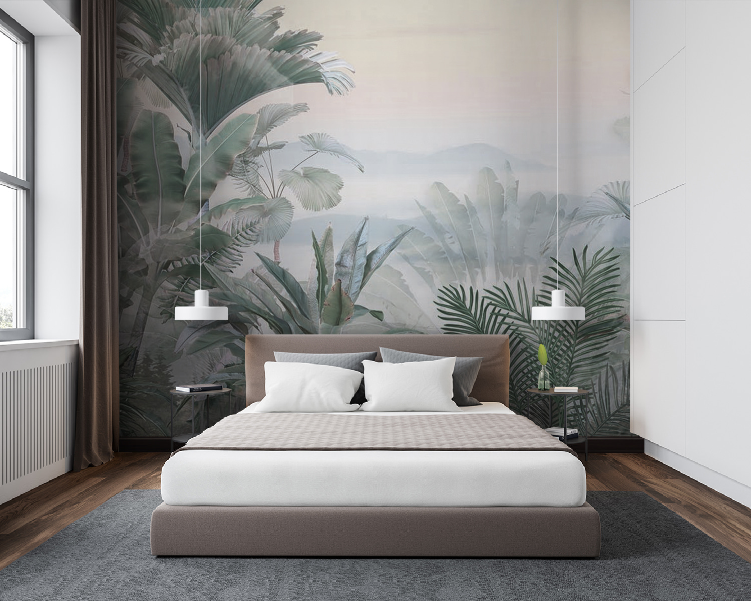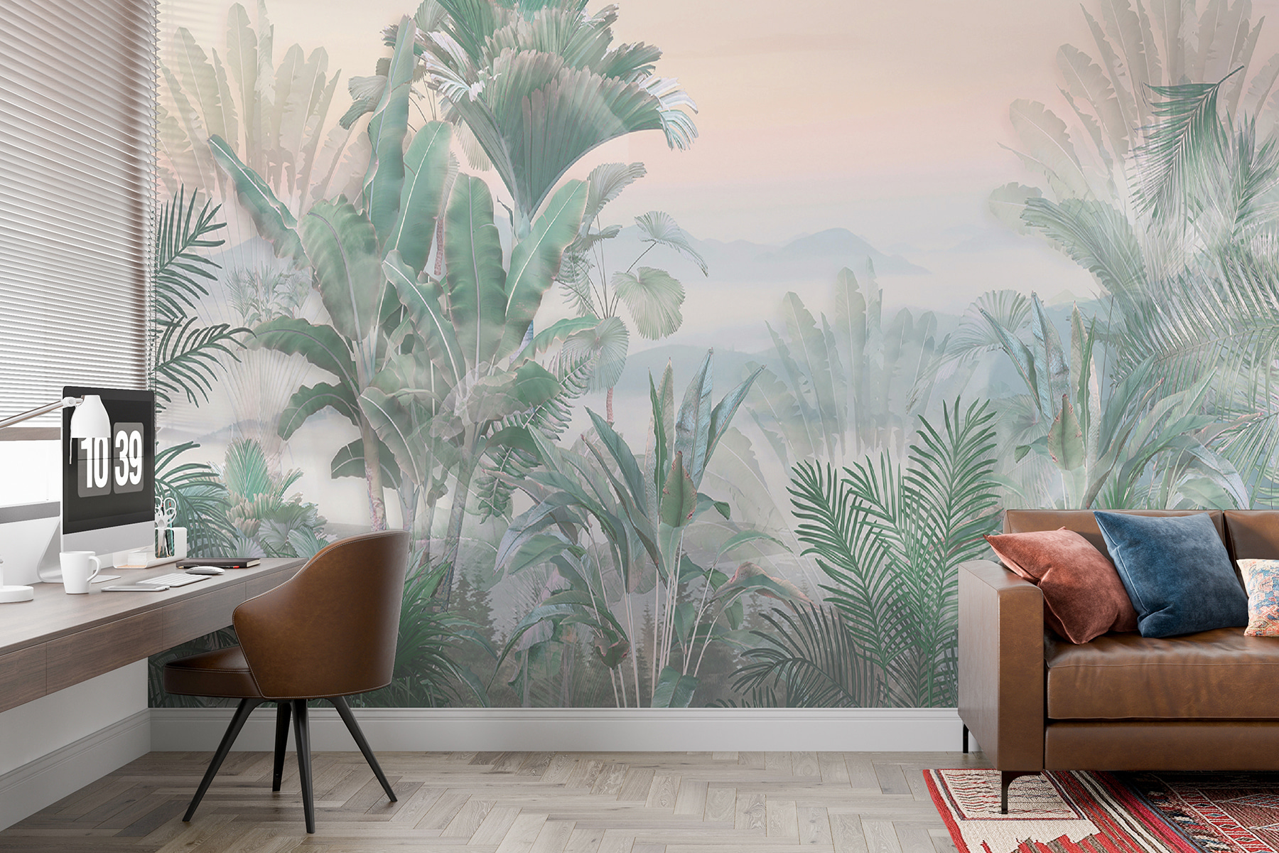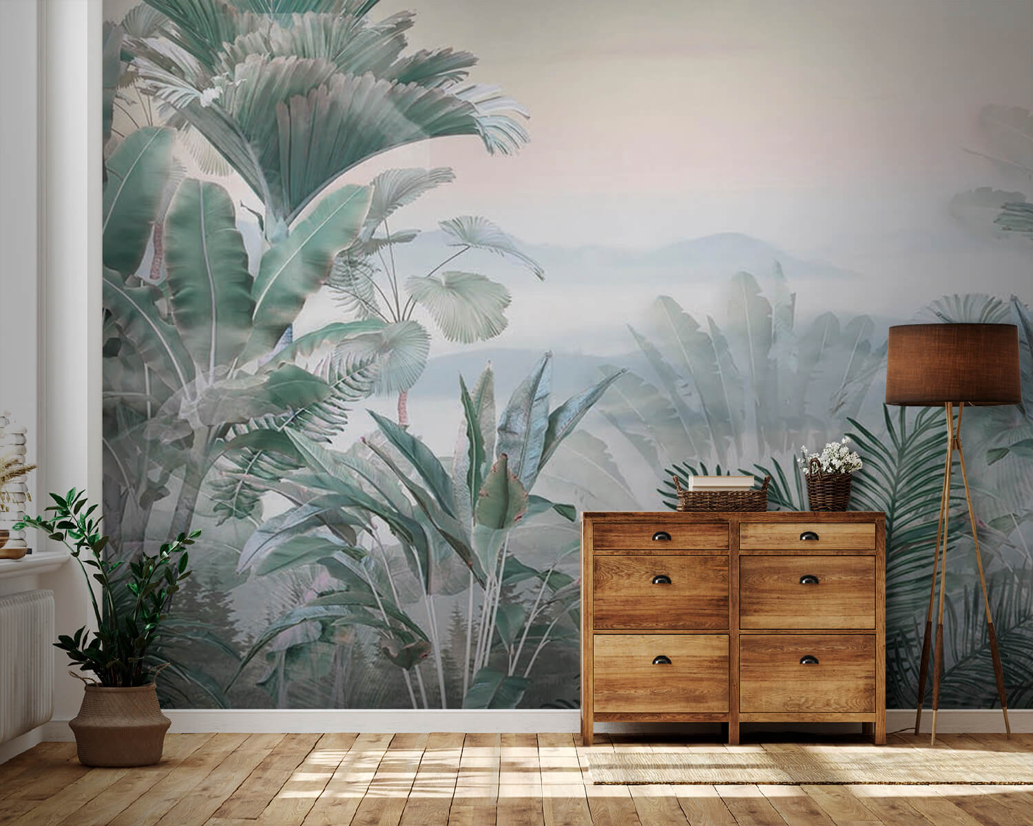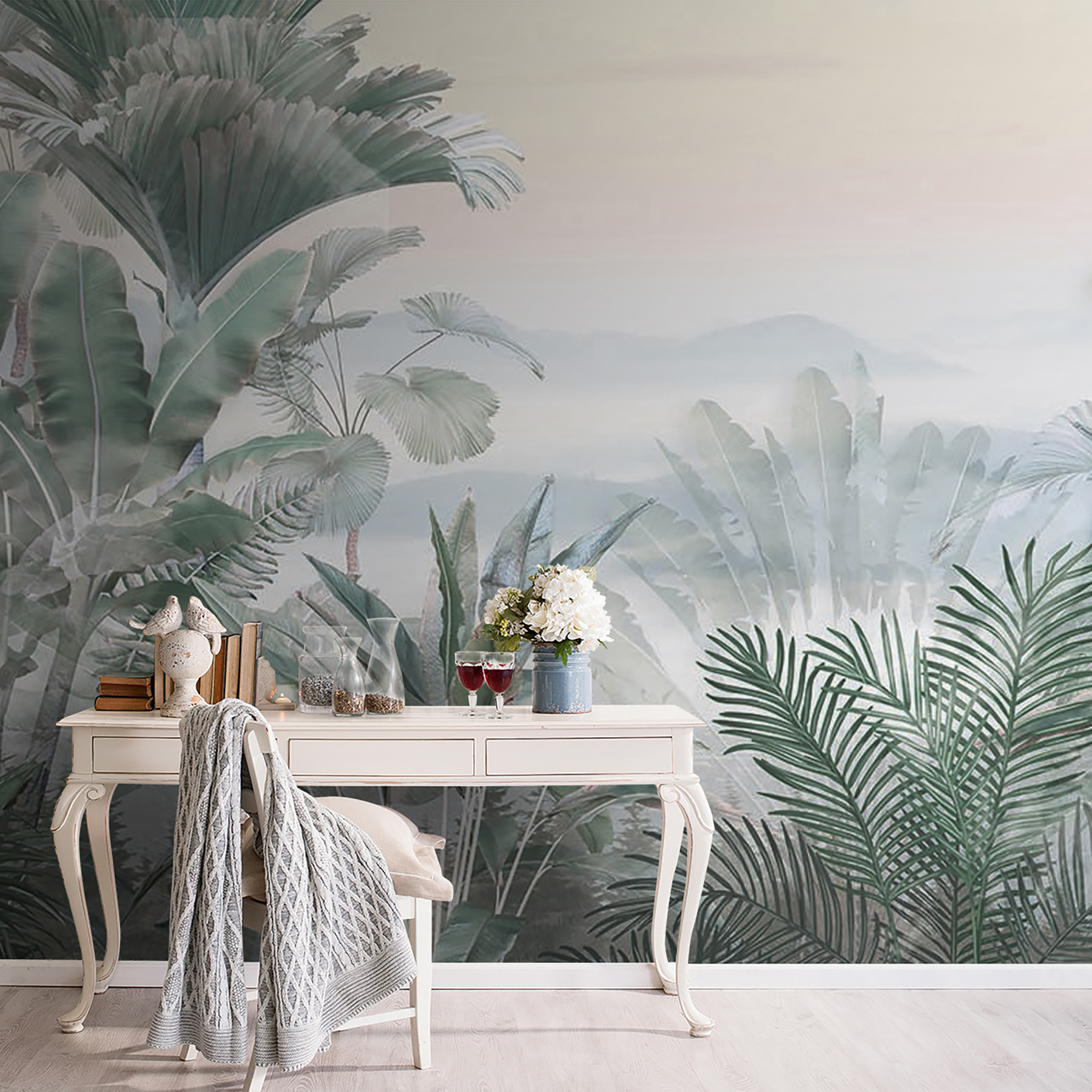 Az egyik legviccesebb dolog, ahogy a pálmalevelek egyszerűen beleolvadnak ebbe az álomszerű ködbe. Megvan a tökéletes egyensúlya annak, hogy feltűnő, mégis megnyugtató. És ha zöld hüvelykujjad van, vagy csak szereted a növényeket, de nem tudod életben tartani őket – ne aggódj! Ez a falfestmény egyetlen csepp víz nélkül is buja, trópusi hangulatot áraszt. Remekül alkalmas arra, hogy elmerülj a gondolataidban, és egy kis zent vigyél a mindennapok nyüzsgésébe.