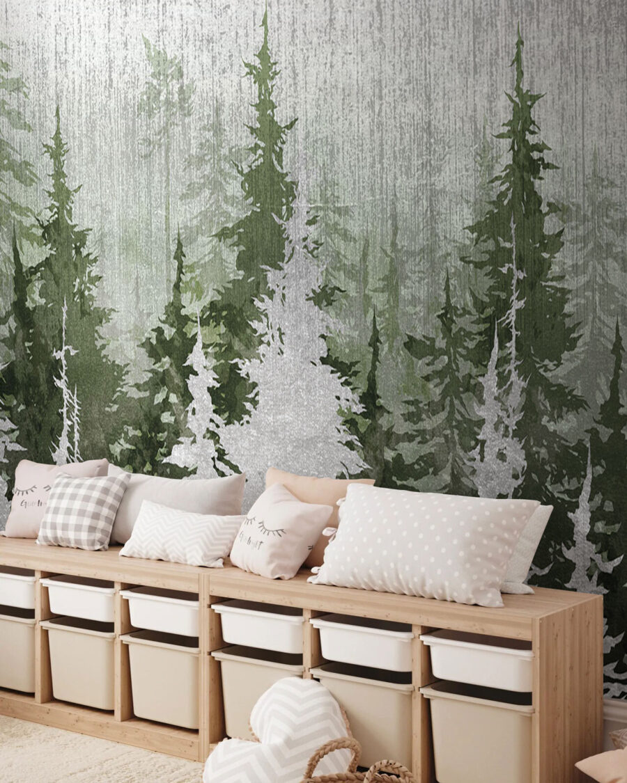 Alakítsa át terét ezzel a varázslatos erdei falfestménnyel, ahol a fák mintha titkokat suttognának a szellőnek. Olyan, mintha egy nyugodt erdőbe lépnél anélkül, hogy elhagynád a nappalidat. Képzelje el a hangulatos estéket, amikor teát kortyolgatva a nyugodt zöld és lágy szürke színeket bámulja. A fák rétegei mélységet teremtenek, szinte olyan, mint egy álomszerű menekülés a mindennapi élet elől. Tökéletes mindenkinek, aki a természet szépségét szeretné meghívni otthonába. Ez a falfestmény nem csak egy falat díszít; életet lehel bármelyik helyiségbe. Még az is lehet, hogy azon kapod magad, hogy vajon egy mókus is elsurran-e mellette!