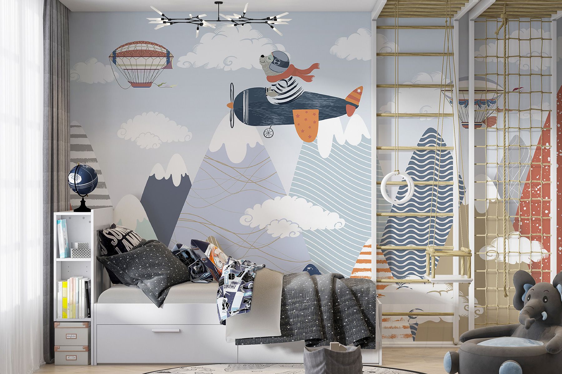 Képzelje el, hogy gyermeke szobájába lépve egy olyan szeszélyes jelenet fogadja, mintha egyenesen egy kalandos történetből lépett volna ki! Ez a falfestmény, amelyen vidám hőlégballonok siklanak a színes, absztrakt hegyek fölött a pelyhes felhők között, varázslatossá varázsolja a teret. Tökéletes arra, hogy beindítsa gyermeke képzeletét – úgy érezhetik, mintha saját égi expedíciójukat vezetnék. A meleg, hangulatos színek és a játékos minták komoly bájt kölcsönöznek. Tökéletes gyerekszobákba vagy játszószobákba, ez a falfestmény nem csak dekoráció, hanem a végtelen kalandok kapuja! Álmodj nagyot, vitorlázz magasra!