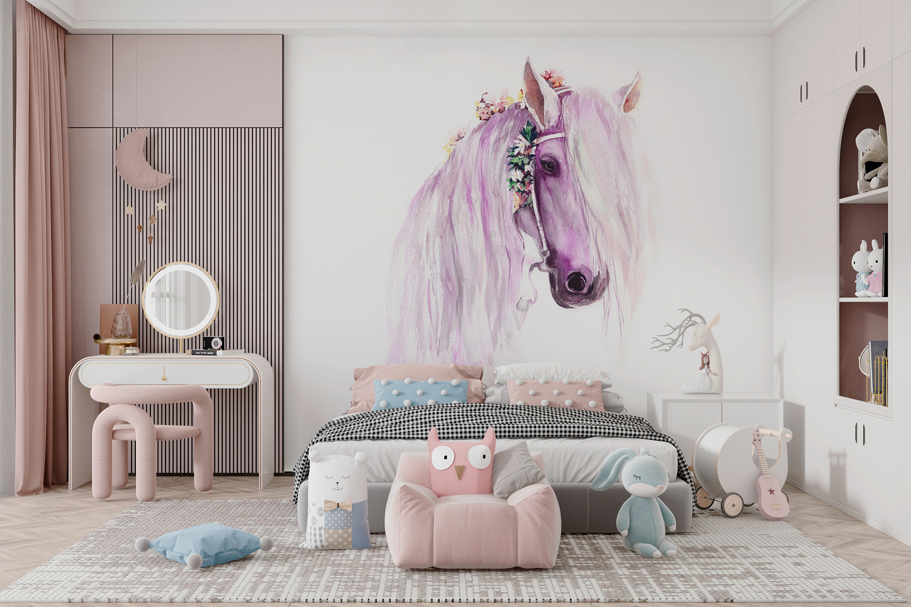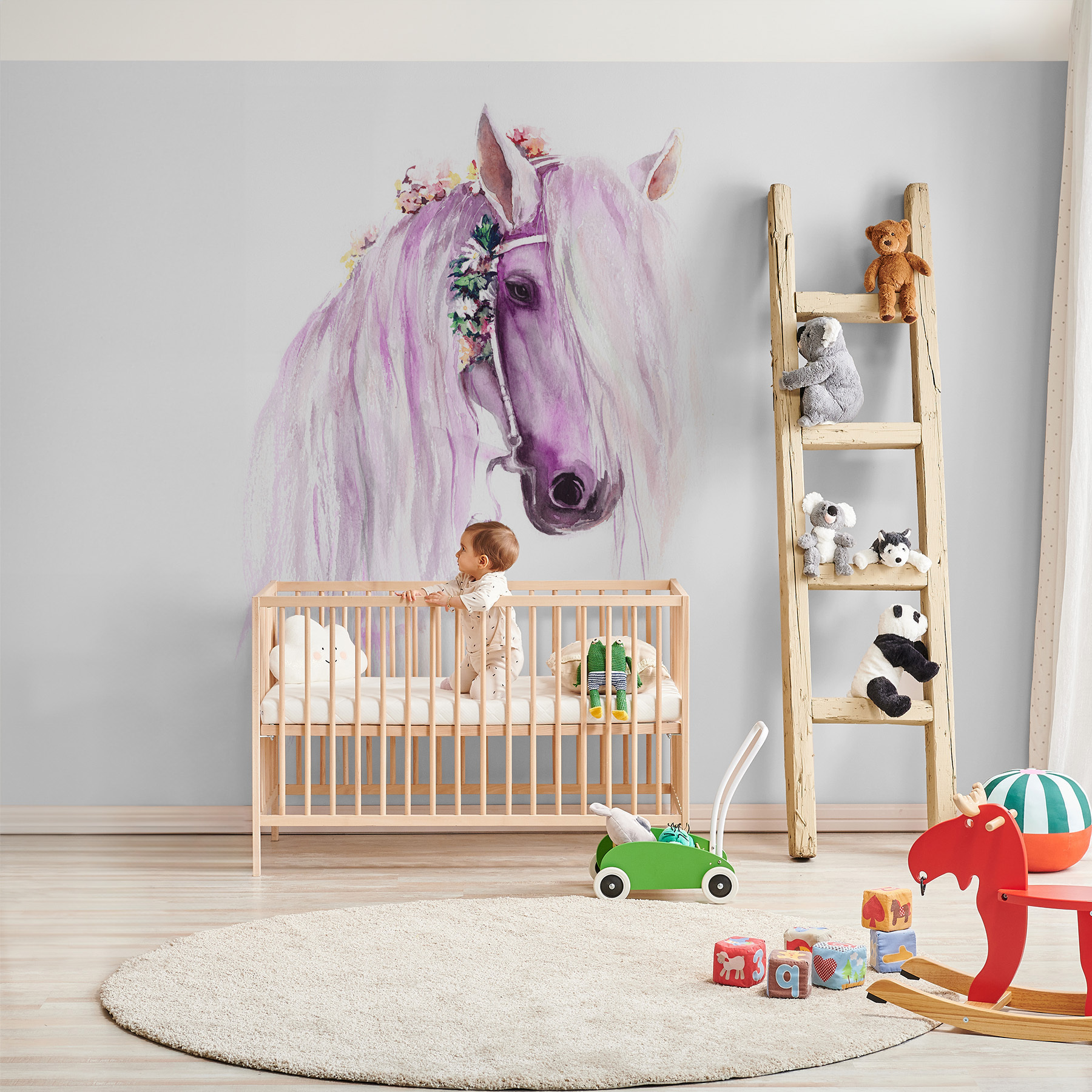 Alakítson át egy szobát ezzel a bájos akvarell falfestménnyel, amelyen egy ló látható, amely úgy néz ki, mintha egyenesen egy meséből lépett volna ki. Képzeld el, milyen varázslatos lesz, ahogy a kicsik bámulják a ló hullámzó sörényét, és milyen szeszélyes hangulatot varázsol a játszószobákba vagy a gyerekszobákba. Ez nem csak egy falburkolat; ez egy meghívás az álmodozásra. Képzelje el a lusta délutánokat, amelyeket a réteken töltött kalandok elképzelésével tölt, miközben a lágy színek gyengéd ölelésbe burkolják a teret. Ez a falfestmény bájos menekülést kínál, amely tökéletesen alkalmas a fiatal képzelet táplálására, vagy egyszerűen csak egy szürke fal feldobására. Ki ne szeretne egy ilyen mitikus barátot?