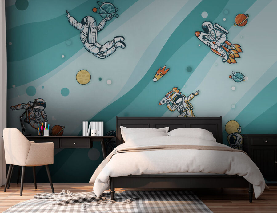 Alakítsd át egy sima falat csillagközi játszótérré ezzel a vidám falfestménnyel, amelyen egy élénk űrhajósokból álló csoport lebeg az űrben. Mindenki, aki elhalad előtte, úgy fogja érezni, mintha egy kozmikus kalandba csöppent volna, színesen illusztrált bolygókkal, játékos üstökösnyomokkal és rengeteg súlytalansági tréfával. Képzelje el, ahogy egy gyermek örömmel mutat a faliképre, és azt állítja, hogy új űrbéli barátot talált, vagy egy felnőtt nevetve nézi, ahogy egy űrhajós úgy rúgja a bolygót, mintha fociedzésen lenne. A megnyugtató akvarell háttér álomszerű hangulatot kölcsönöz a képnek, így tökéletes választás hálószobába, játszószobába vagy akár kreatív irodai térbe is. Ez nem csak dekoráció, hanem jegy az űrbe!