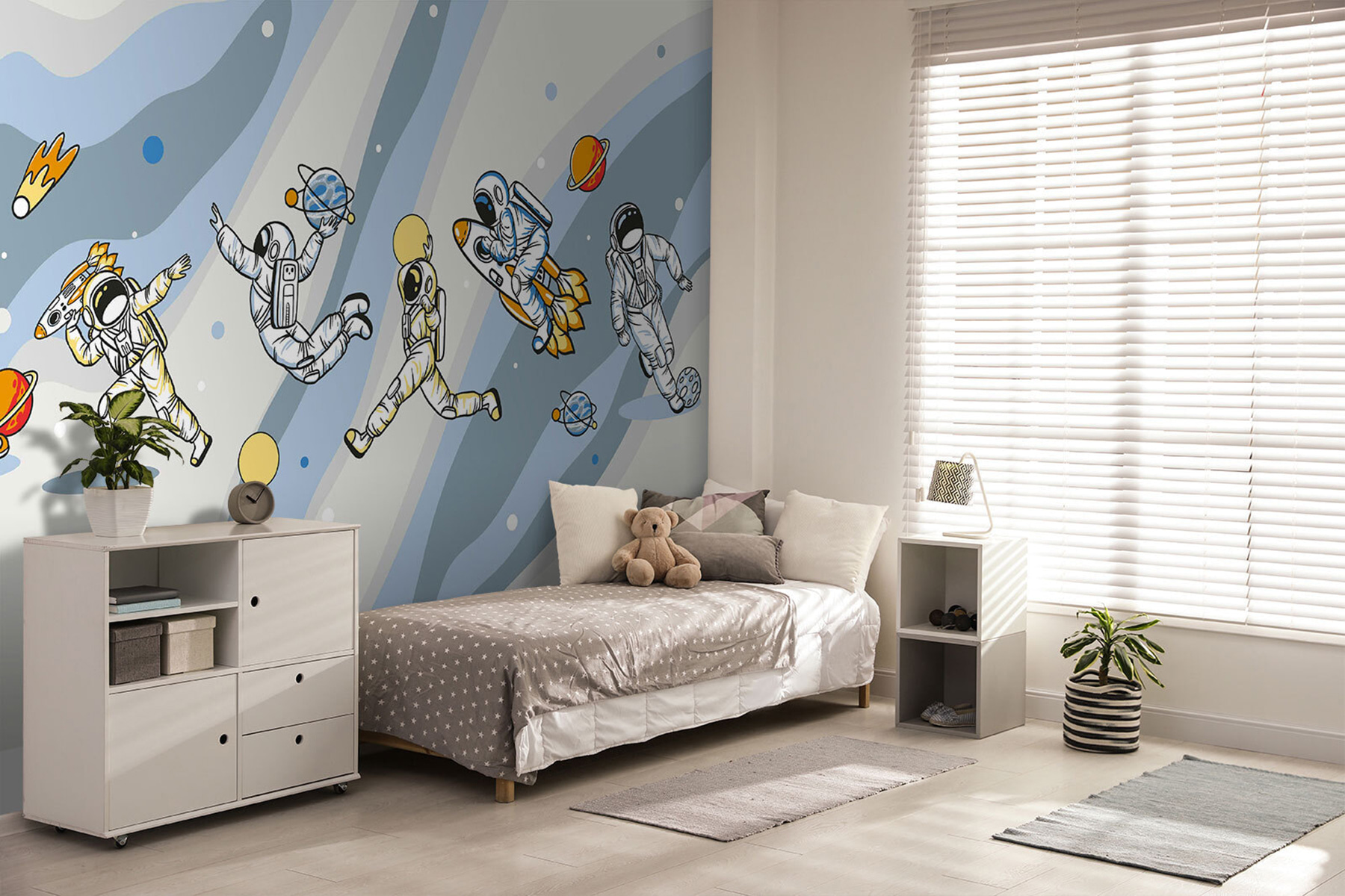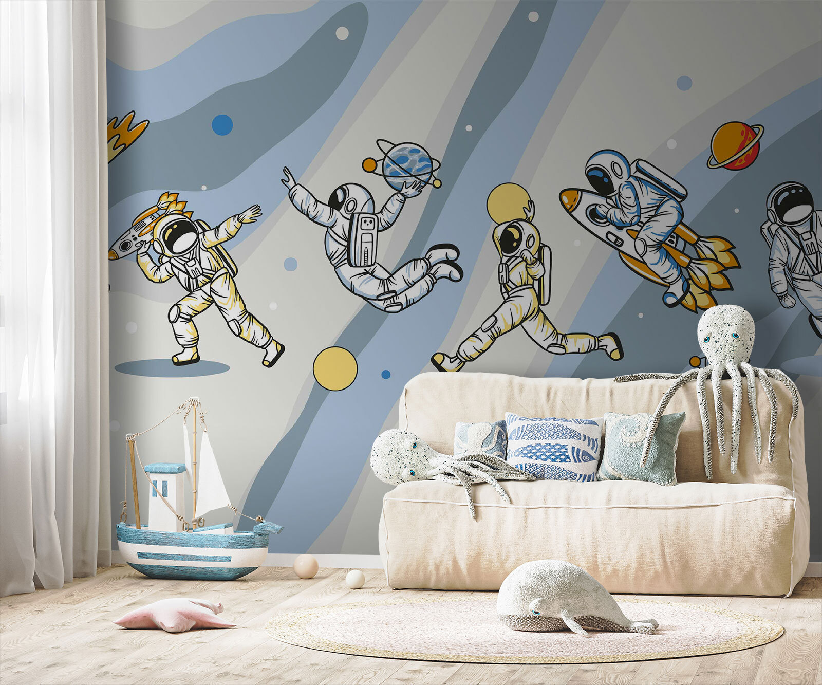 Nézd meg ezt a nagyon menő falfestményt – “Egy űrhajós karikatúrája rakétával a fején”. Olyan, mint egy életre kelt képregény, amely tökéletesen alkalmas arra, hogy vidámságot és kalandot varázsoljon bármelyik szobába. Képzeld el, hogy ez egy gyerekszobában vagy egy játékszobában van… az apró részletek, mint például a bolygók körül táncoló űrhajósok, egyszerűen mosolyt csalnak az arcodra. Ráadásul teljesen beindítja a képzeletet – ki ne szeretne űrutazásokról és rakétahajókról álmodozni? Szórakoztató, furcsa és egy kicsit túlzó, ahogyan minden jó kalandnak lennie kell. Szuper mókás módja annak, hogy egy teret kreatívvá és élénkké tegyünk!