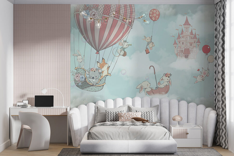A kicsik imádni fogják a bájos részleteket – egy koala virágkoronával, apró nyuszik lufikkal, és mindezek bolyhos felhők között lebegnek, a háttérben egy álomszép kastéllyal. Az egész jelenet olyan varázslatos, mintha a saját meséjükbe csöppennének, amint felébrednek.