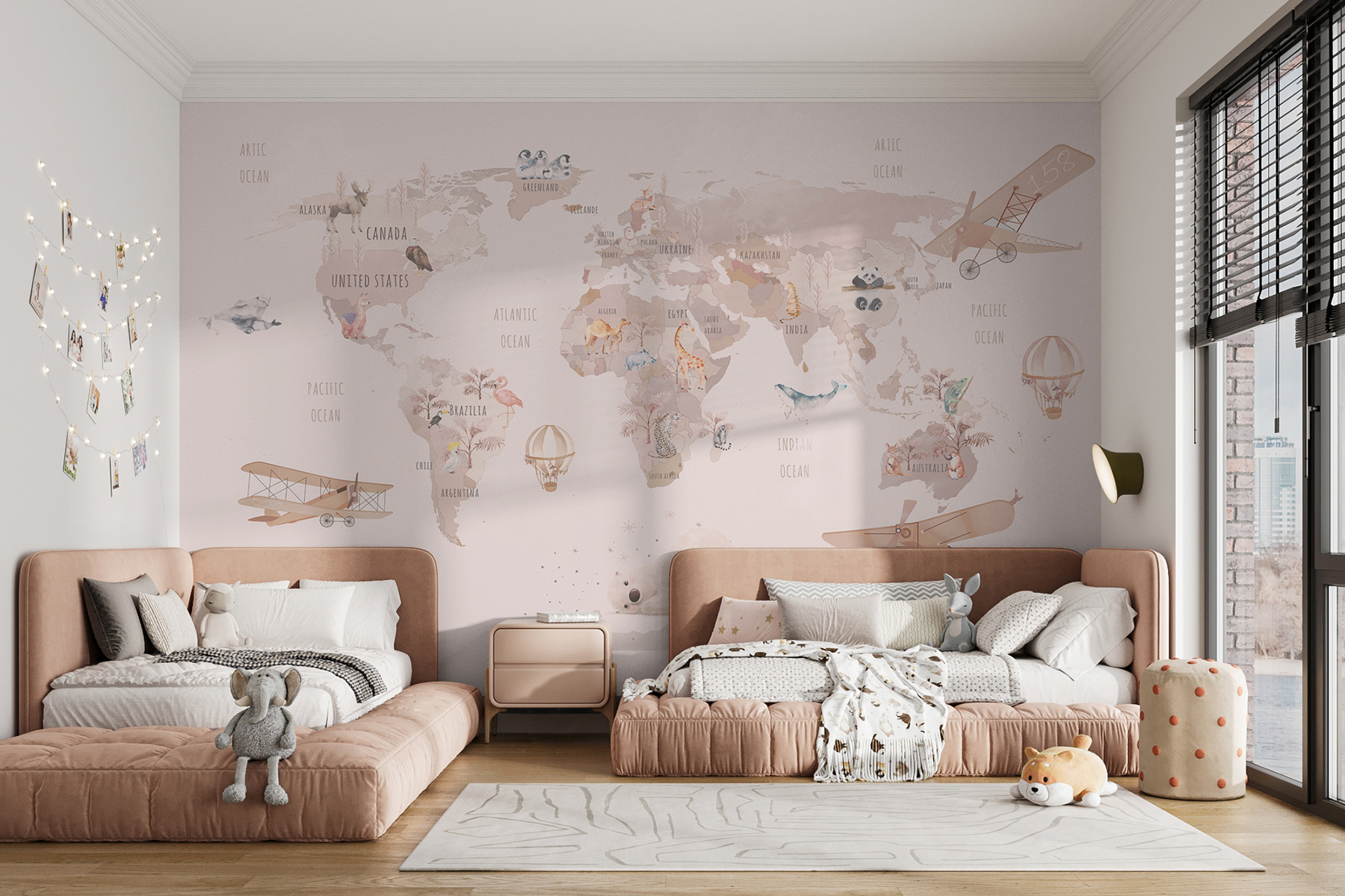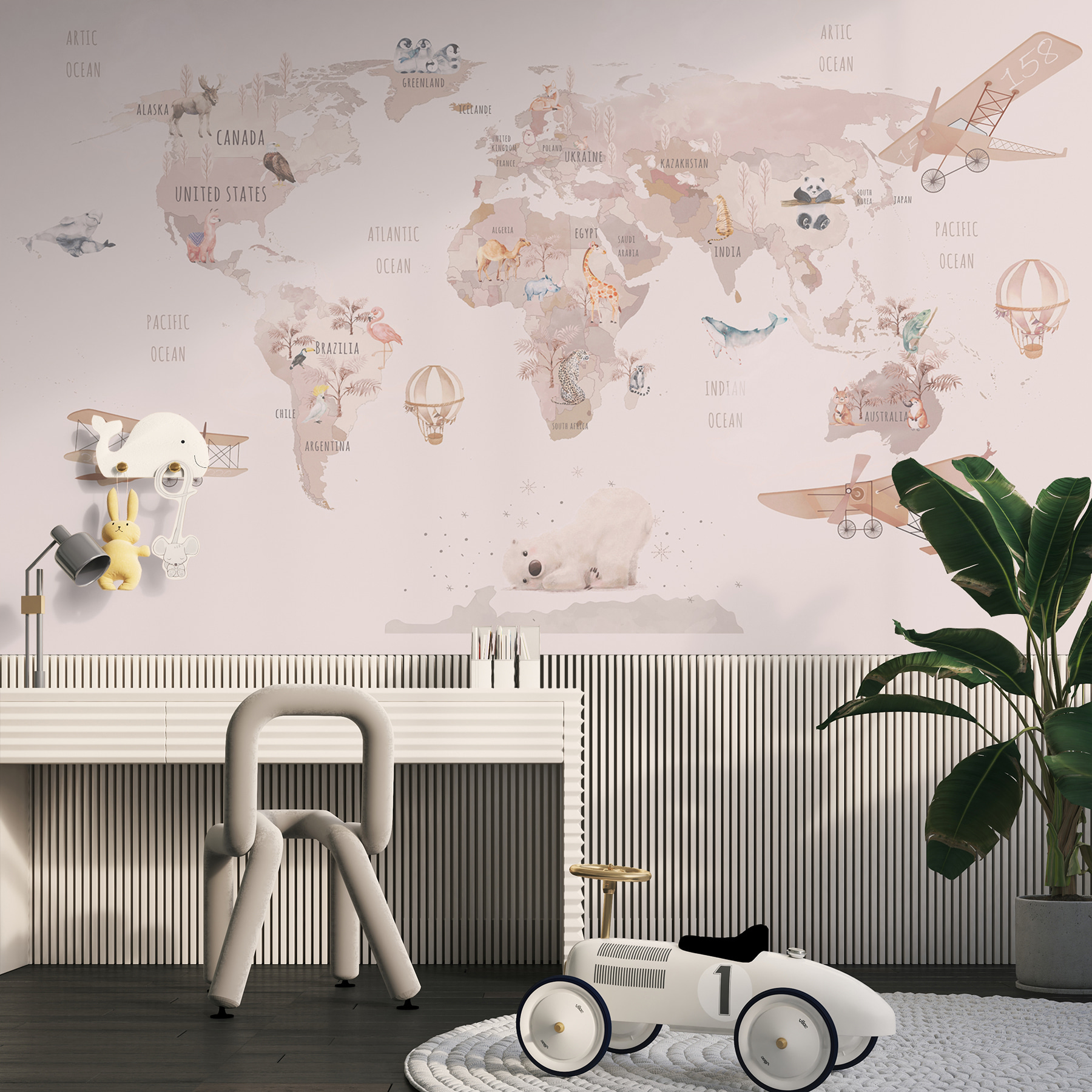 Bármely szobát varázsolhatsz szeszélyes utazásra a Föld körül ezzel a bájos falfestménnyel, a “Világtérképpel”. Olyan, mint egy szerelmes levél a kalandhoz, állatok és játékos repülőgépek elbűvölő illusztrációival, amelyek azonnal kíváncsiságot és vándorlási vágyat ébresztenek. Képzeld el, ahogy a kicsik kedvenc országaikat mutogatják, vagy egzotikus tájakról álmodoznak, miközben e bájos minták veszik körül őket. Lágy színeivel és játékos elemeivel a falakat a képzelet vásznává változtatja – tökéletes gyerekszobákba vagy játszószobákba. Ez a falfestmény nem csak díszít; történetekre és álmokra hívogat. Szóval, induljunk felfedezőútra!