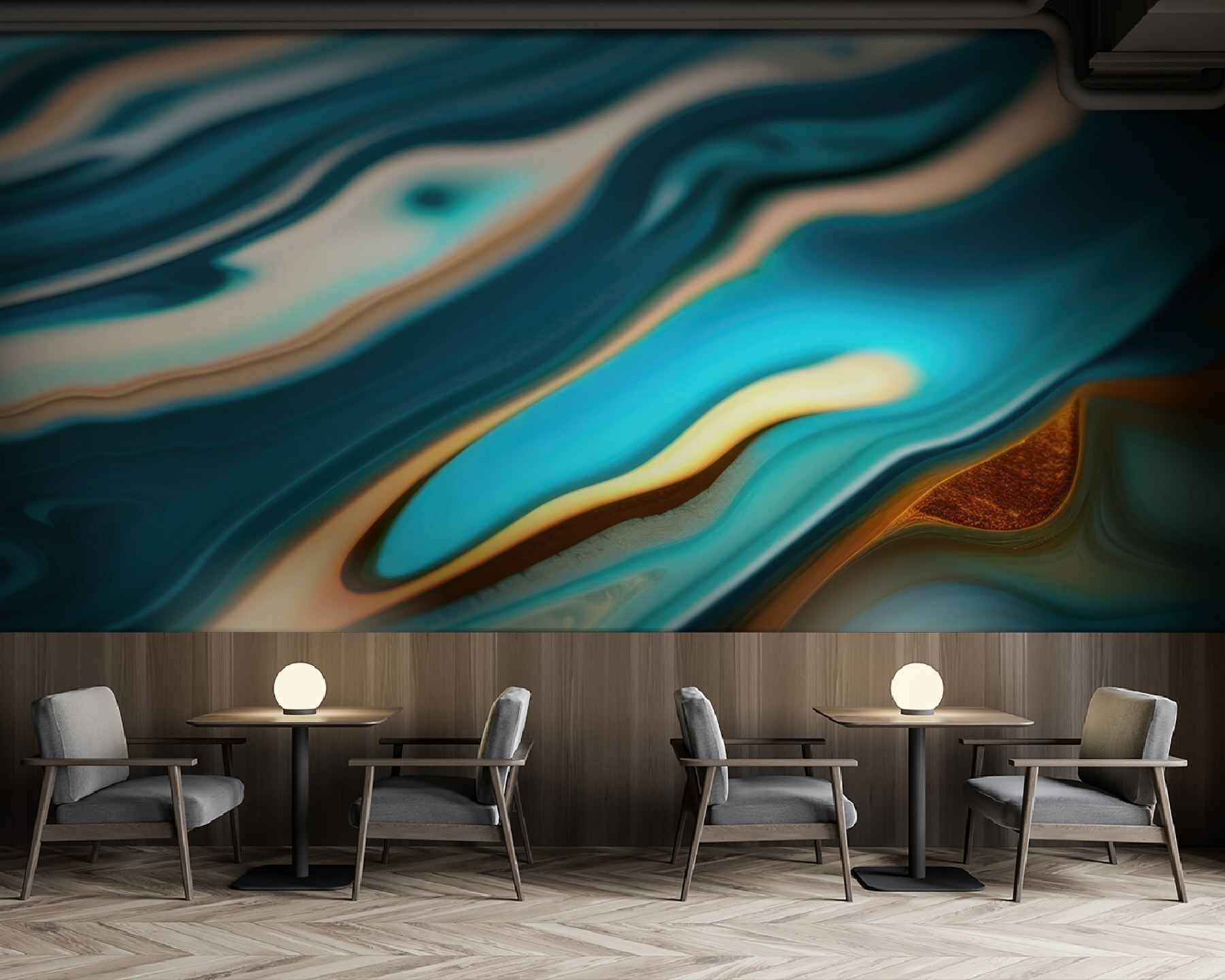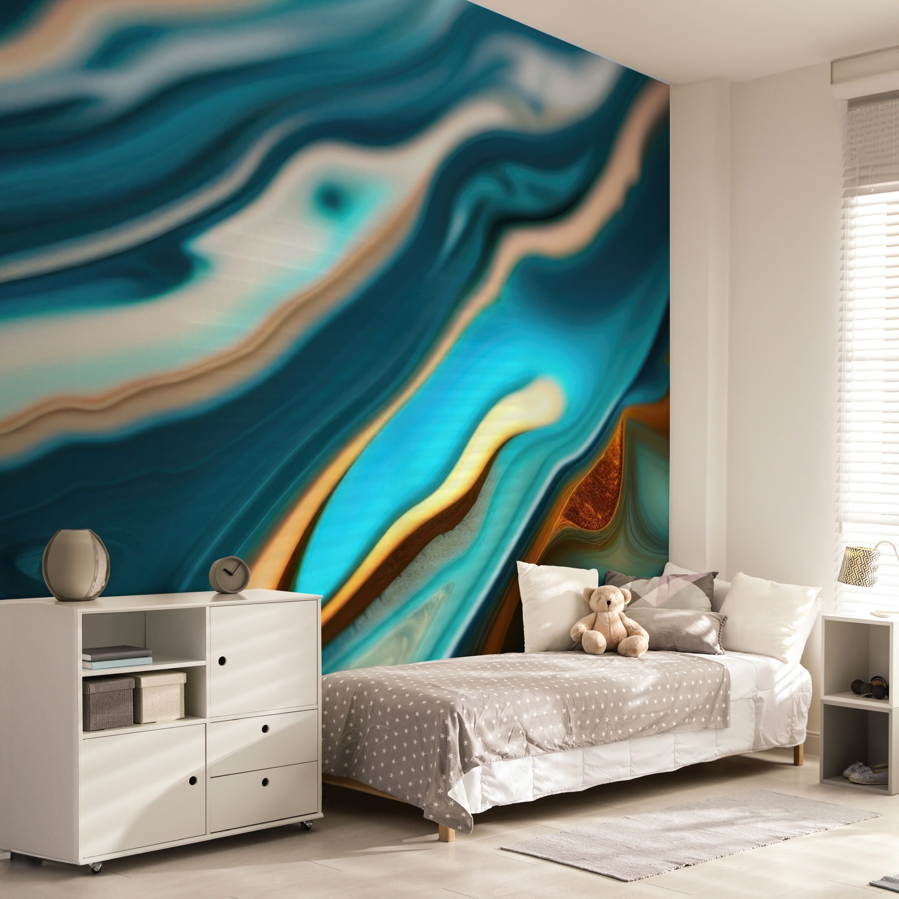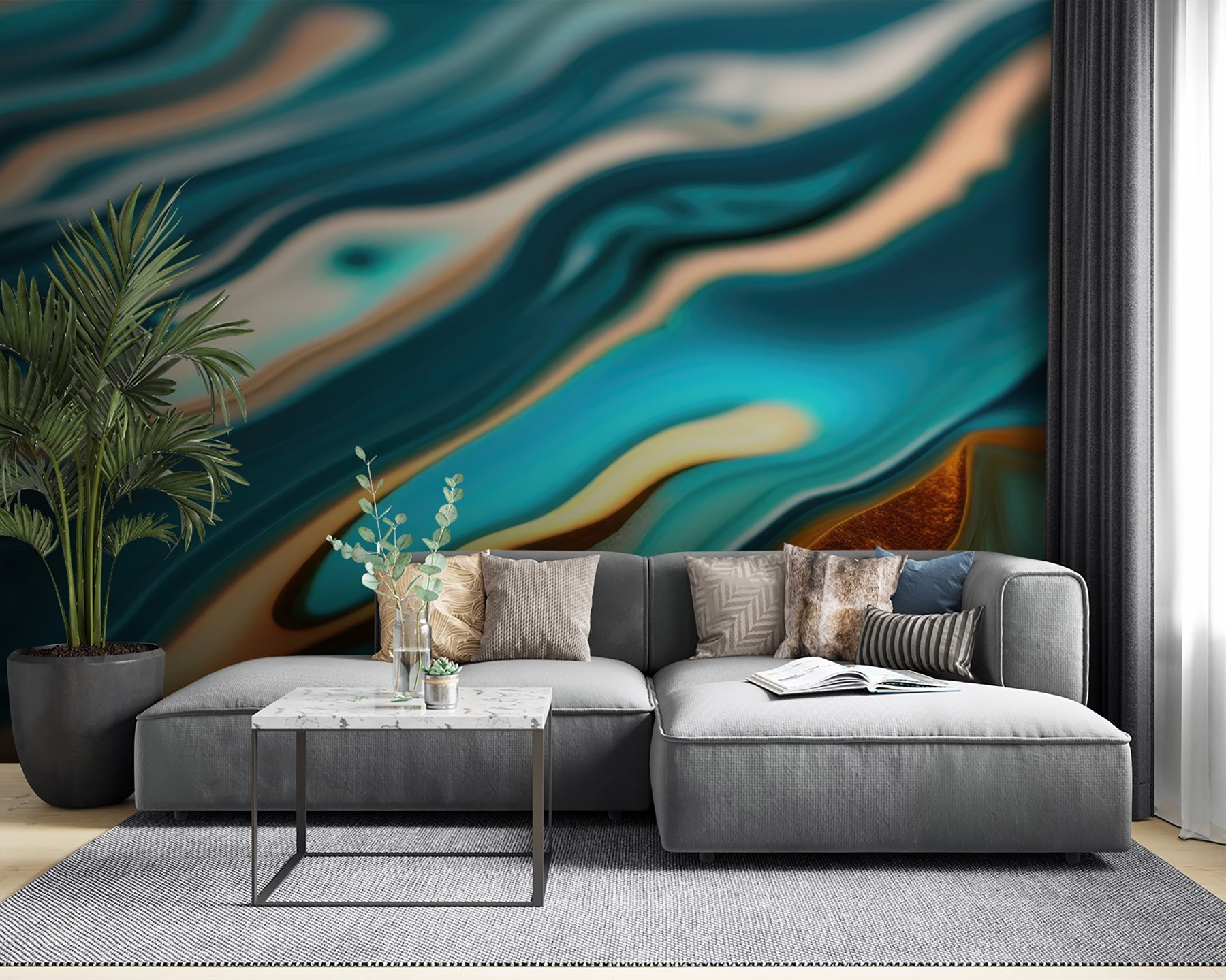Egy fal átalakítása, hogy harmonikus mintákban áramló színeket ragadjon meg, olyan, mintha egy nyugtató szellőt hívna meg otthonába. Képzelje el, hogy felébred, belép a szobájába, és úgy érzi, mintha egy tengerparti kiránduláson lenne – leszámítva a homokot a cipőjében. Ez a falfestmény a kék színek és a meleg akcentusok keverékét mutatja be, amelyek együtt táncolnak, olyan vizuális dallamot alkotva, amely megnyugtatja az elmét. Tökéletes egy hangulatos zugba, ahol kávét kortyolhatsz és elmélkedhetsz az életről, vagy egy vibráló élettérbe, amely beszélgetésre késztet. Adja hozzá ezt a falfestményt, és hagyja, hogy minden pillantás egy mini vakáció legyen.
