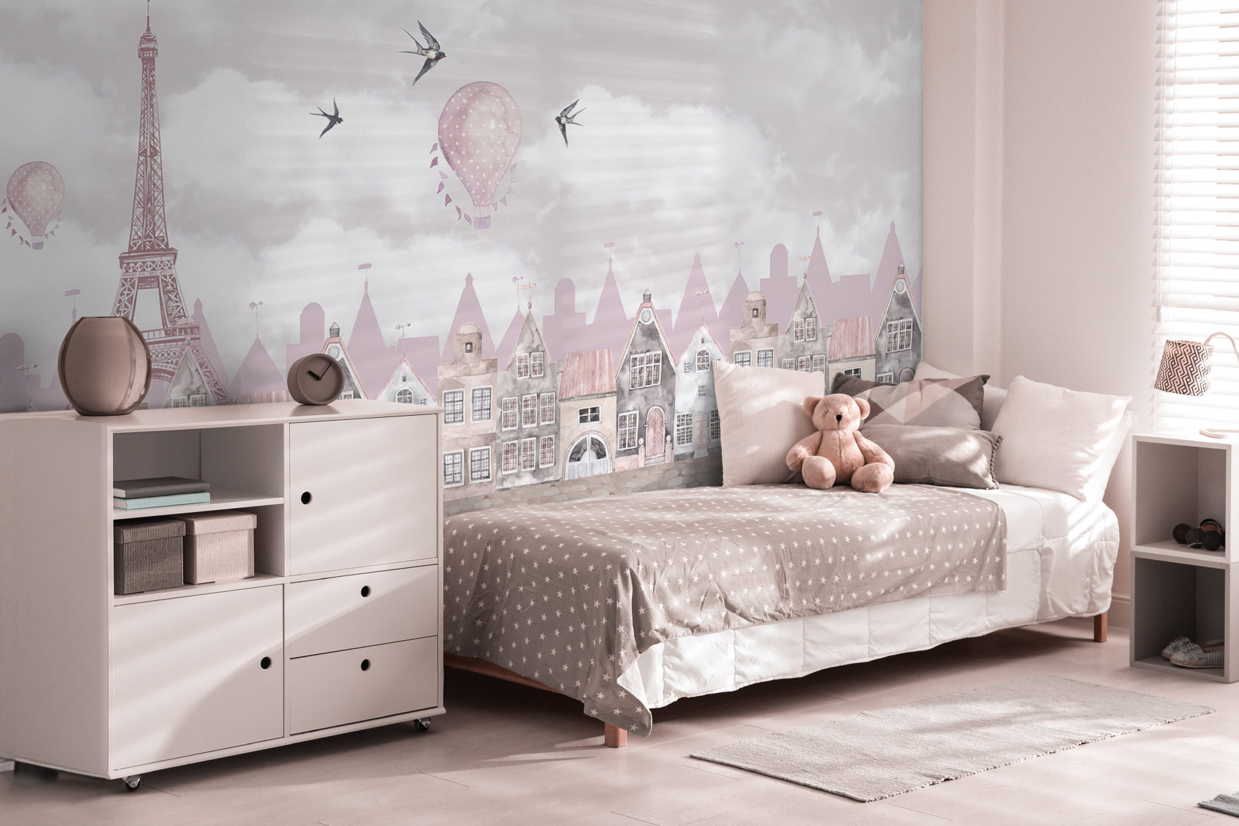Képzelje el, hogy belép egy szobába, és a szeszélyes égbolton szárnyaló madarak, lágyan sodródó hőlégballonok és bájos háztetők varázslatos látványa fogadja, egyenesen egy meséből. Ez a “Madár repül az égen” falfestmény életre kelti ezt a fantáziát. Tökéletes gyermekszobába, beindítja a képzeletet, és álomszerű érzéssel tölti meg a teret. A lágy, pasztellszínek és a finom részletek nem csupán egy falfestményt, hanem egy olyan történetet varázsolnak belőle, amelybe beleléphetsz. Van valami megnyugtató a kis madarakat figyelni, olyan, mint egy lágy szellő a léleknek. Ráadásul ki ne szeretne egy kis varázslatot a falára? Ez a falfestmény az elegancia és a játékosság elragadó keveréke – ideális arra, hogy meghitt, varázslatos hangulatot teremtsen bármelyik lány szobájában.